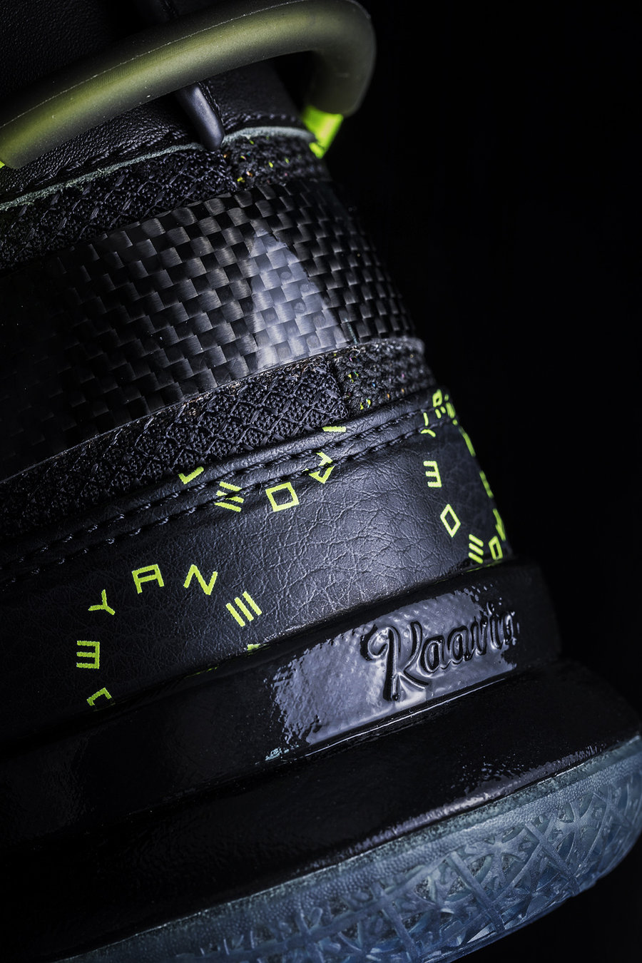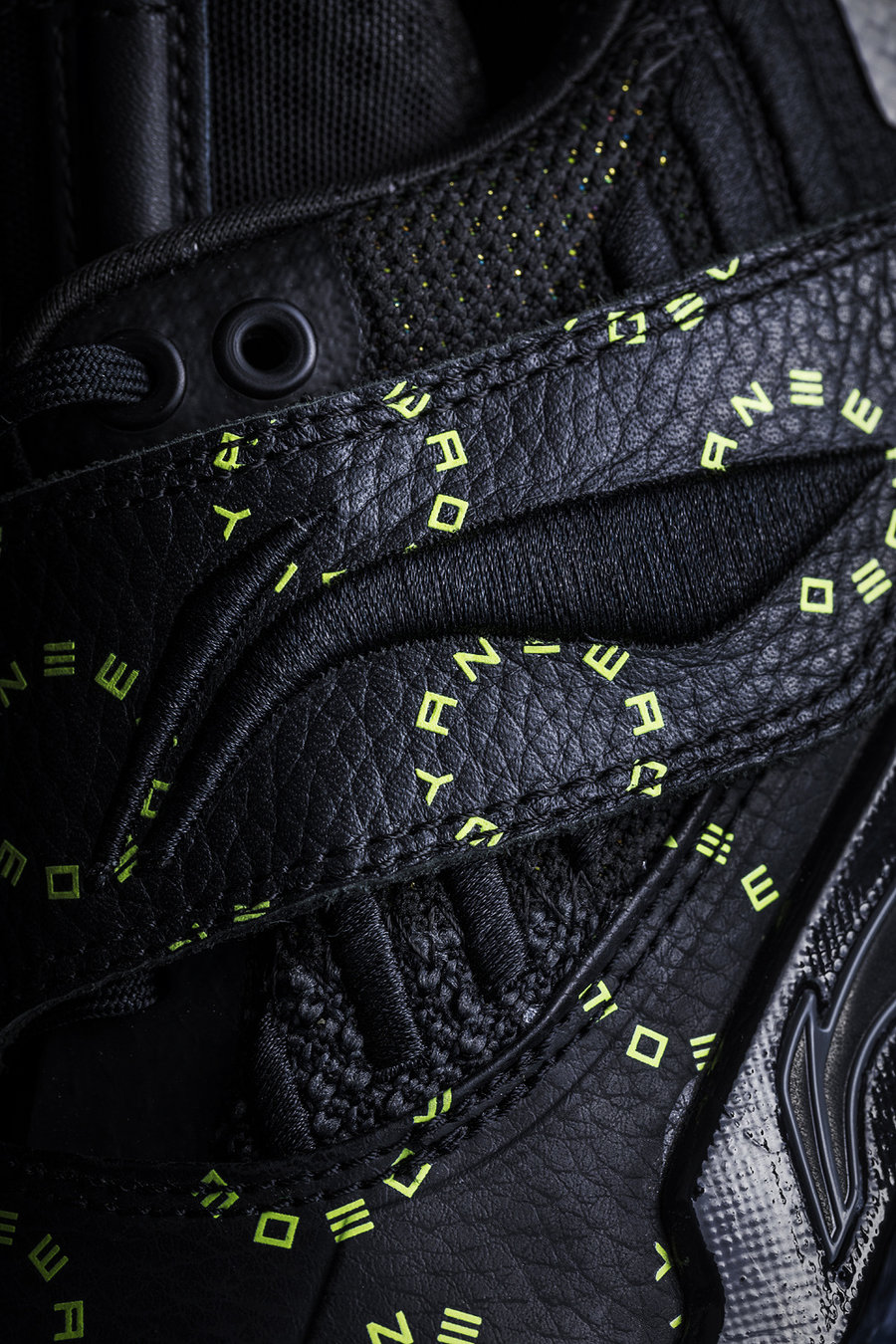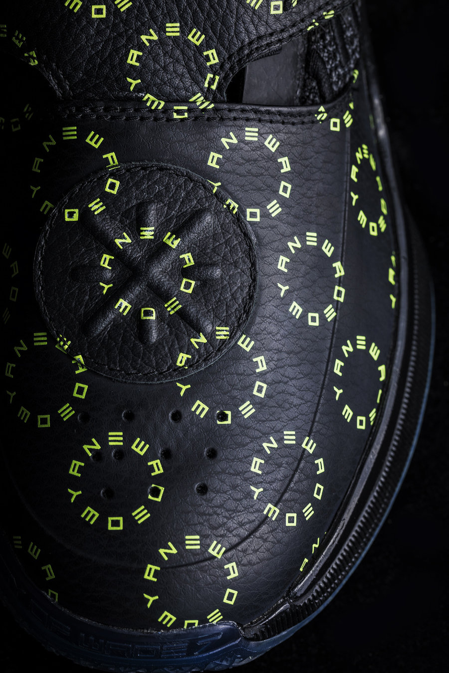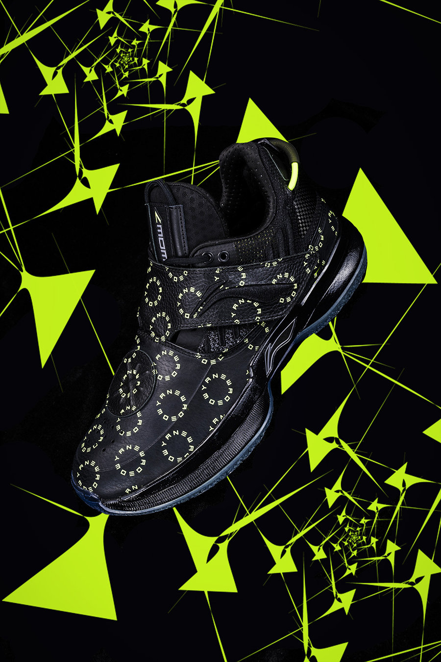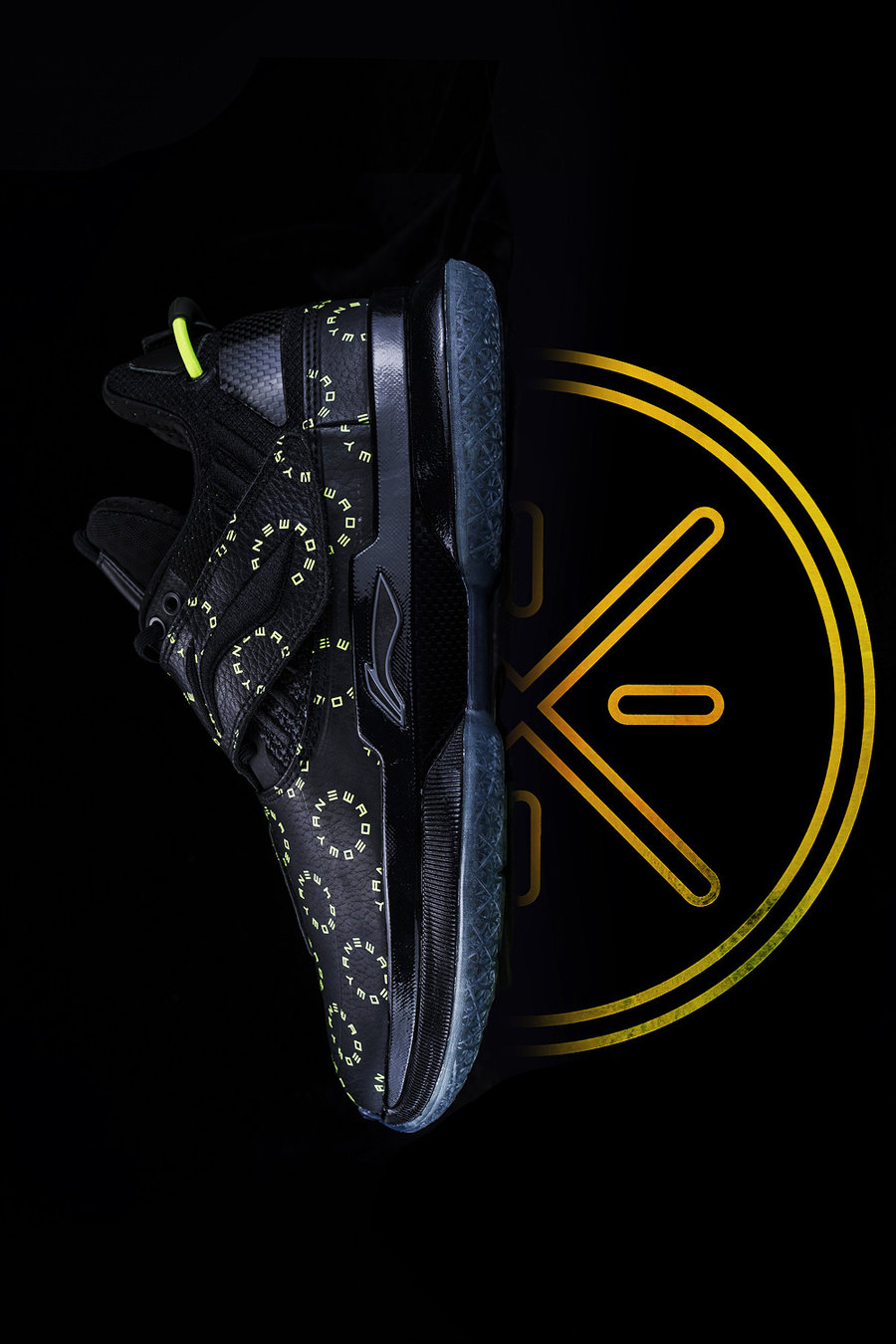 这款韦德之道 7 以黑色为主体,酷劲十足。鞋面布满绿色字母组成的圆环图案,增加亮眼元素。