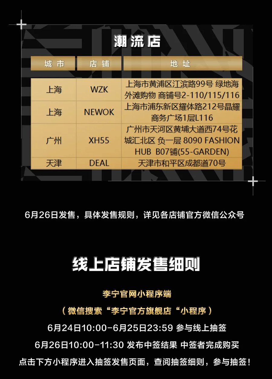 部分李宁线下店铺、李宁时尚店以及潮流店铺也将同步发售,详情参见下方发售细则。