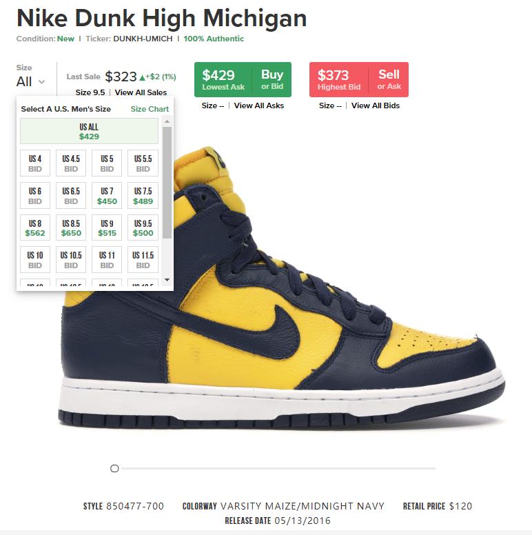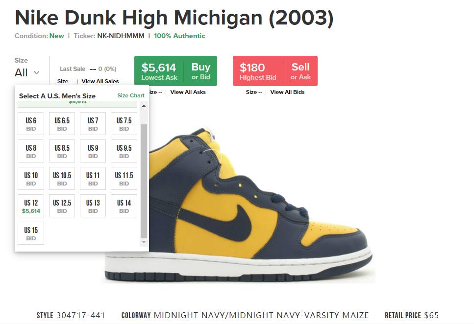 2003 年版本的 Nike Dunk High “Michigan” 在 StockX 上的售价高达 $5000 美元以上,仅有一个码数。