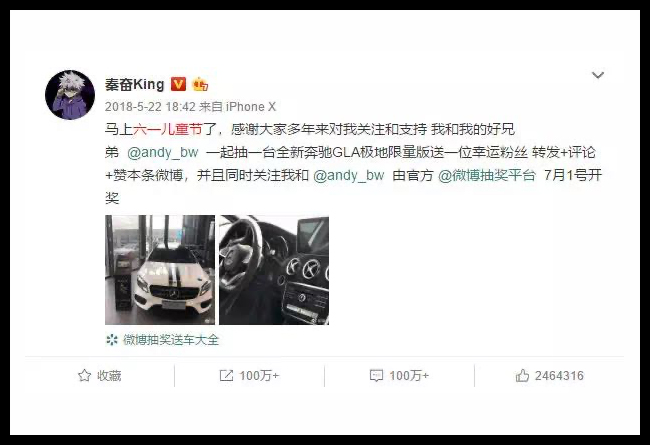 不仅撞车,秦奋还常常在微博抽奖送车,要知道这难度可比 Dior x Air Jordan 1 大多了!有钱人的快乐恐怕就是这么简单。