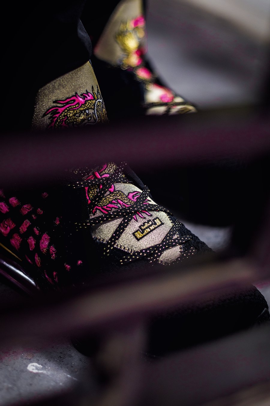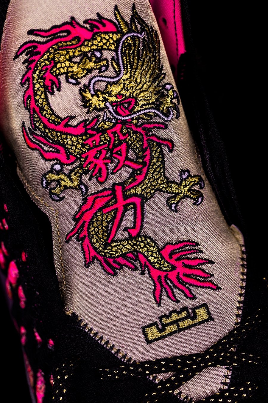 鞋舌采用缎面打造,与刺绣盘龙、毅力与勇气字样完美融合,算是目前 LeBron 17 中最讨国人欢心的设定,华丽感满分。