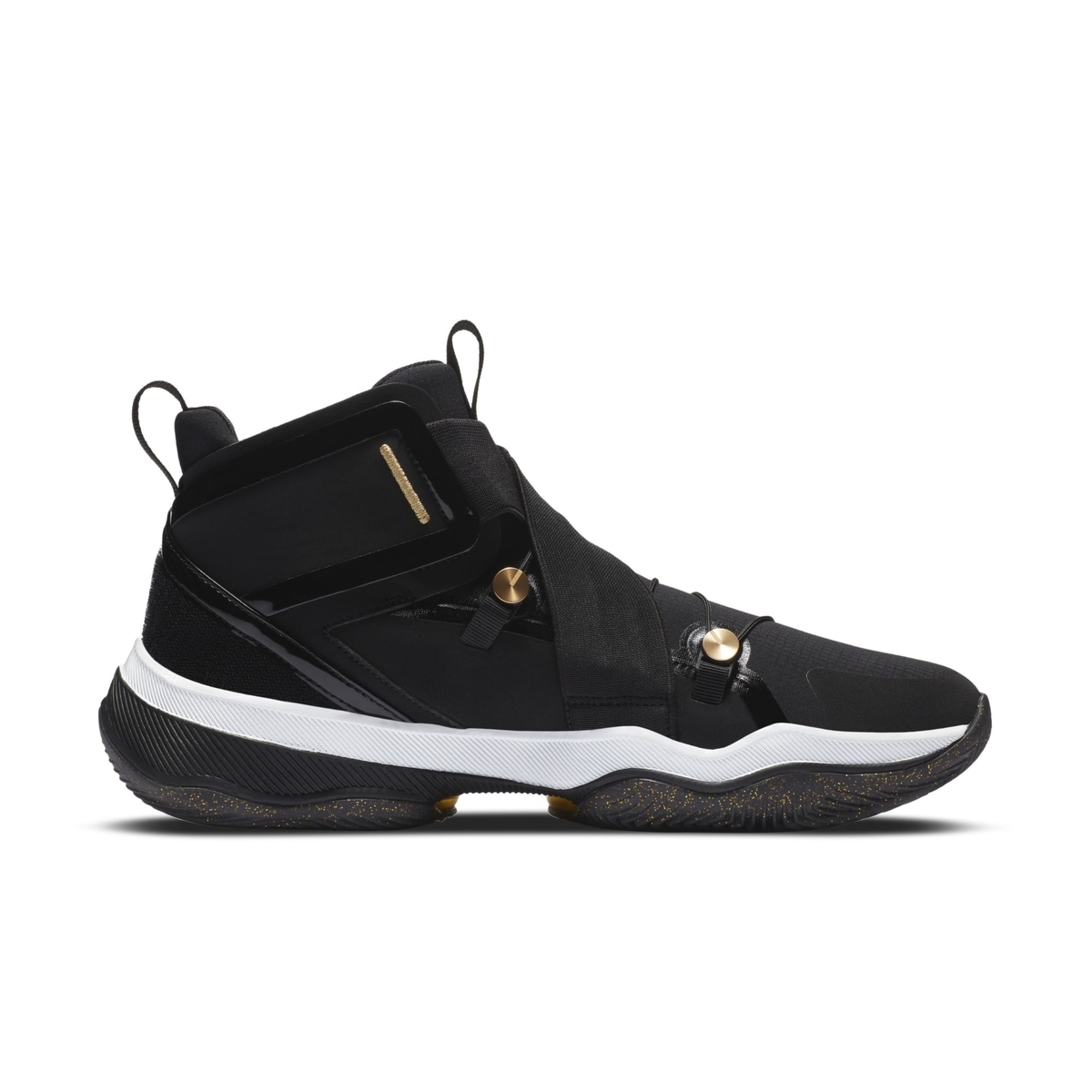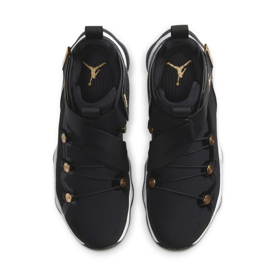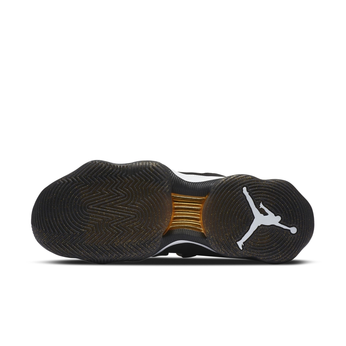 整双鞋以代表低调奢华的黑金搭配为主调,第一看上去外观与 Air Jordan 11 颇有几分相似之处,大面积的黑色基础上在细节中加入金色点缀,就连外底都有碎金装扮。