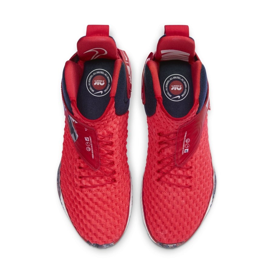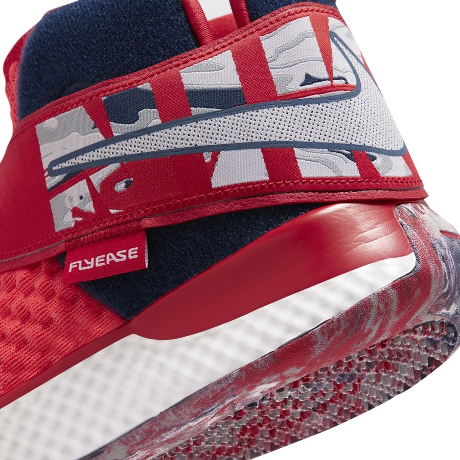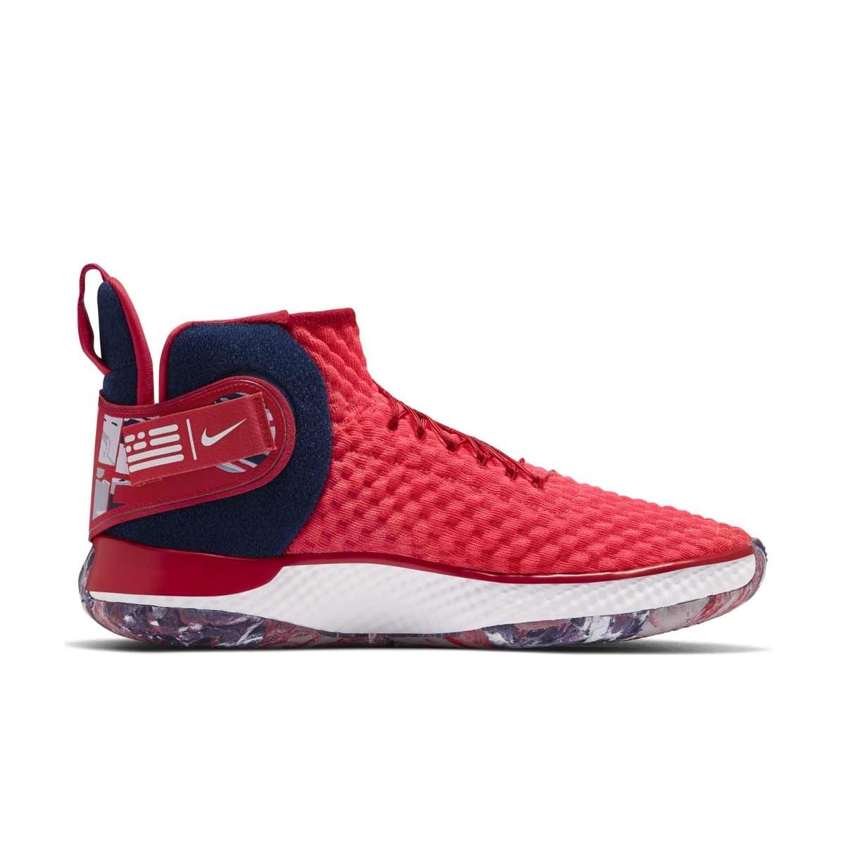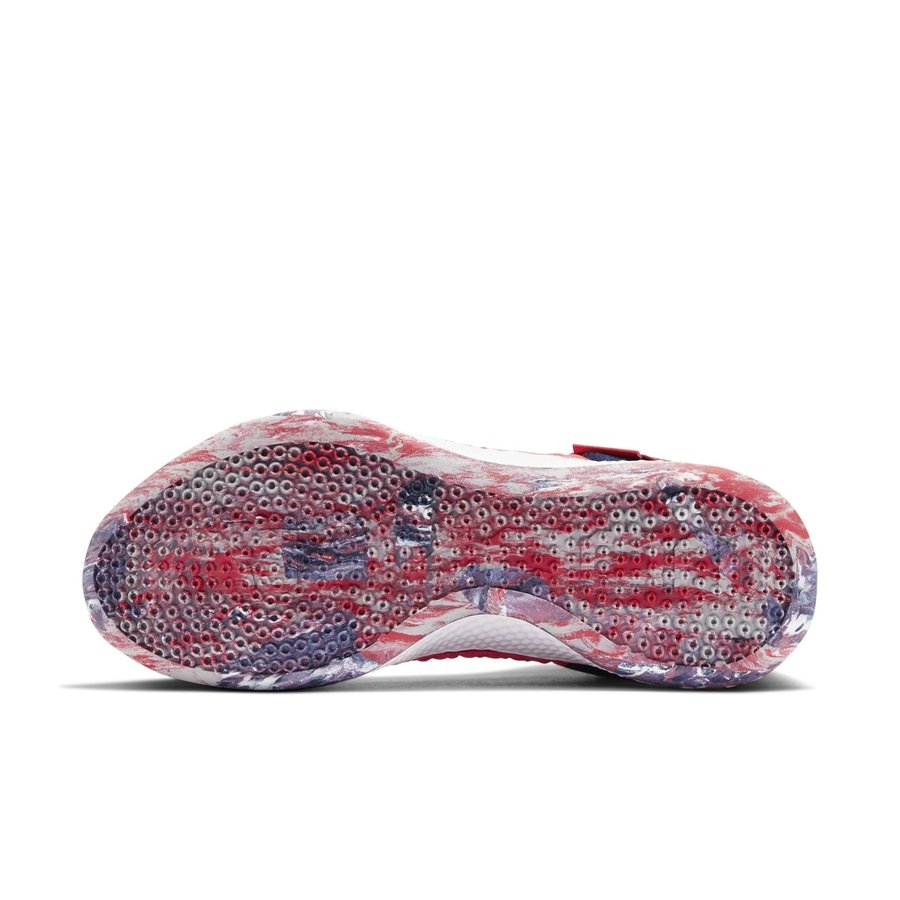 鞋身以红色为主色调,搭配蓝白两色点缀,颇有些美国队的气息。