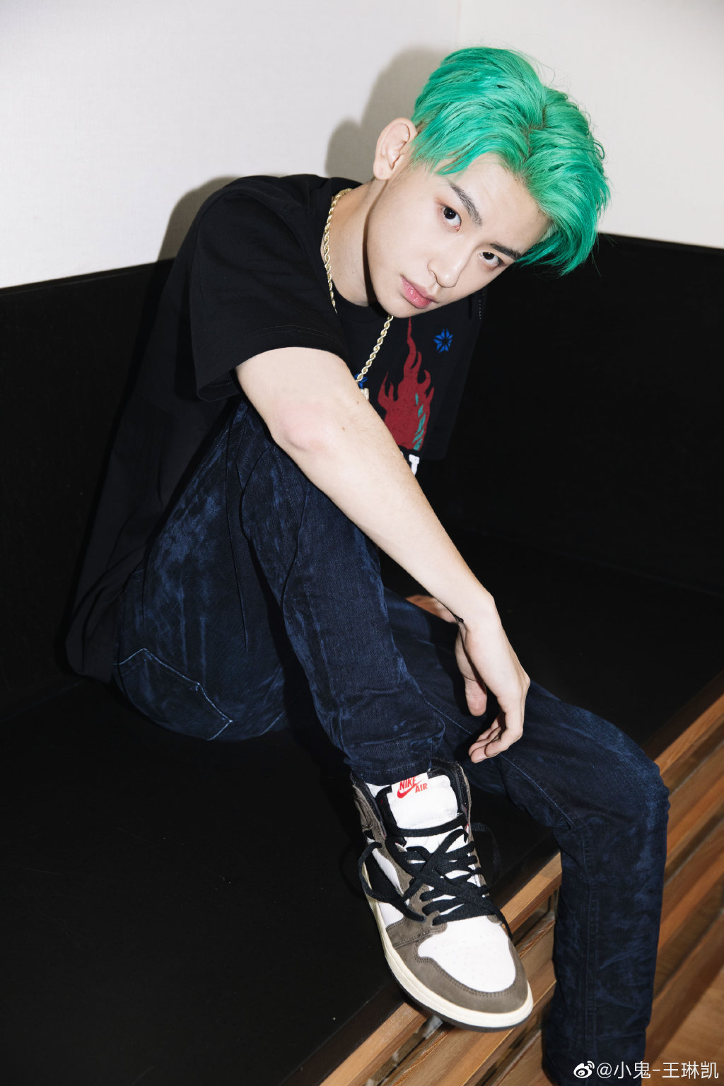 在型录和杂志定妆照中,选以 Travis Scott x Air Jordan 1 联名上脚。