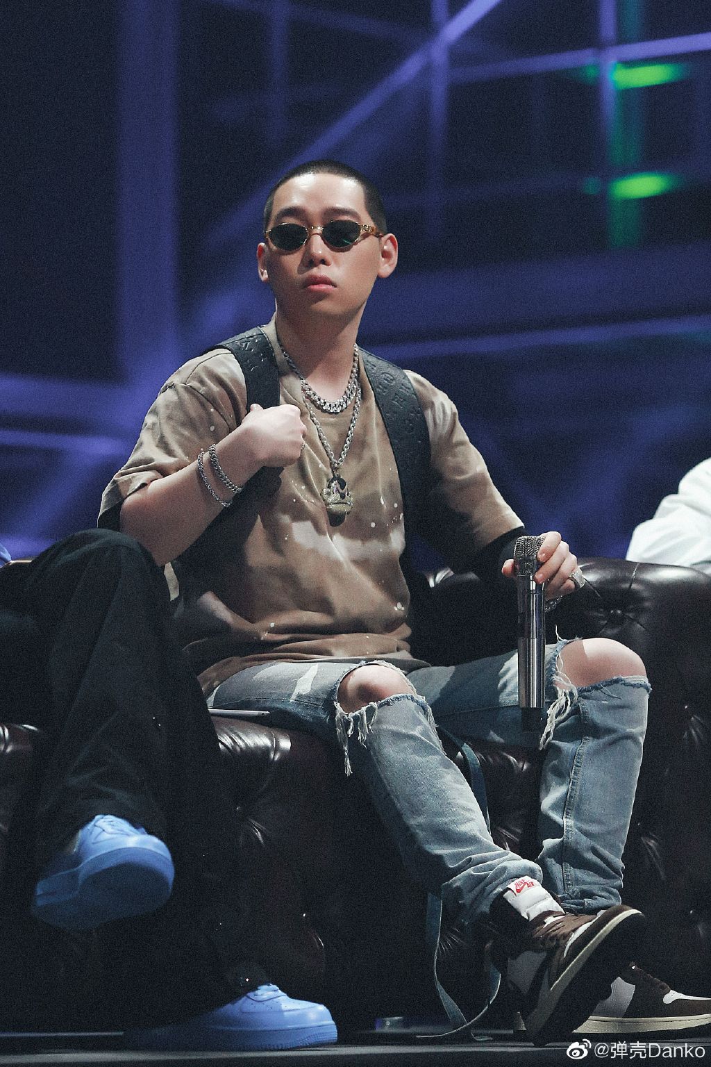 后边场次还以大地色大底搭配破洞牛仔裤,与脚下的 Travis Scott x Air Jordan 1 搭的非常有格调。
