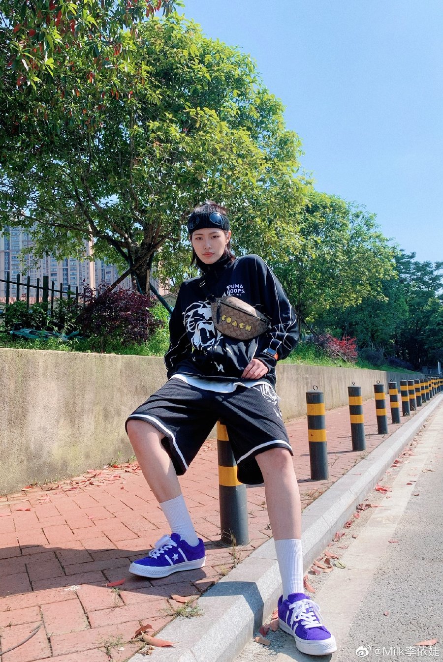 City Boy 感觉的卫衣 + 短裤,搭配脚下的亮紫色 Converse,酷劲十足。