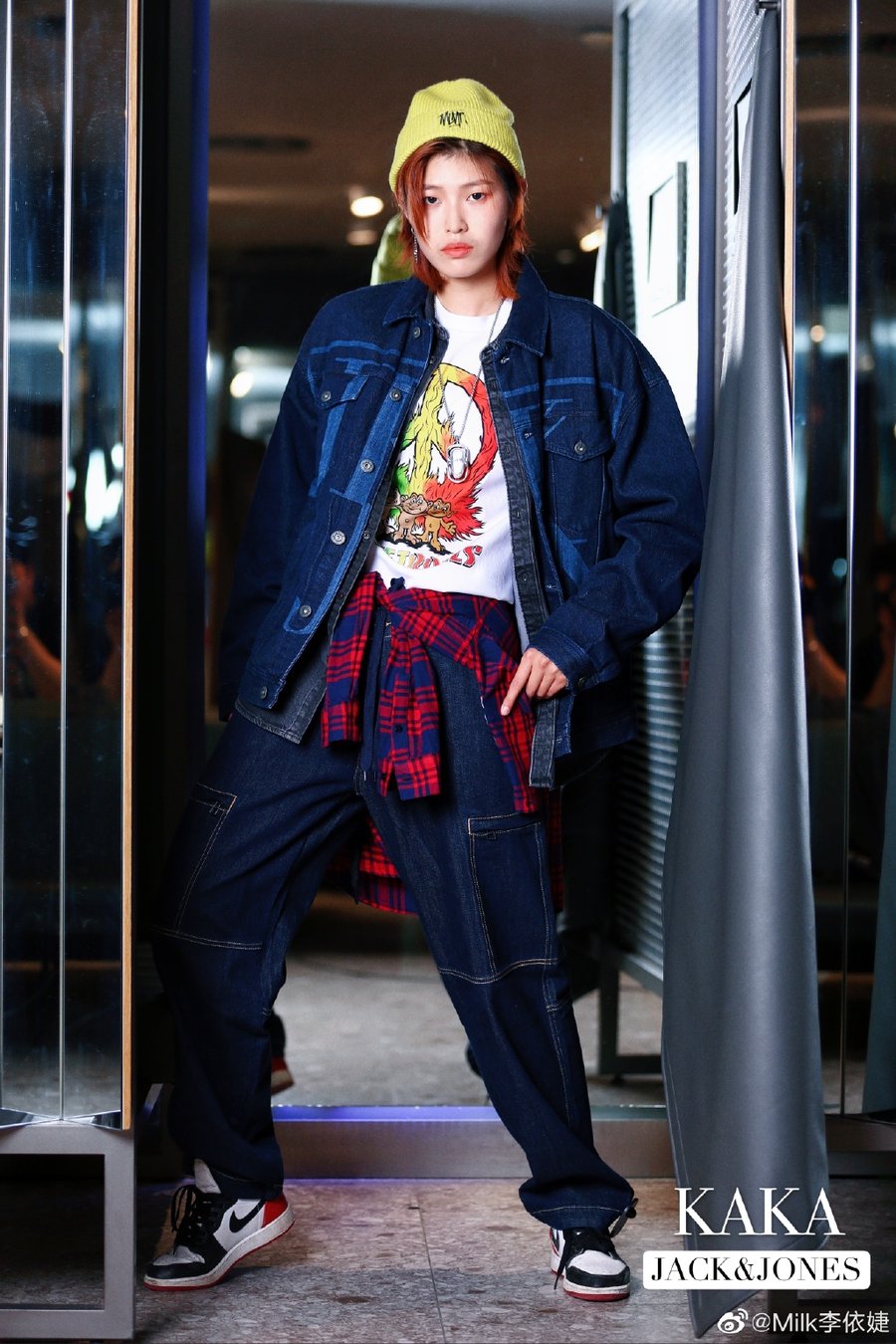 同样,换成牛仔套装搭配黑脚趾 Air Jordan 1,同样是不错的搭配。