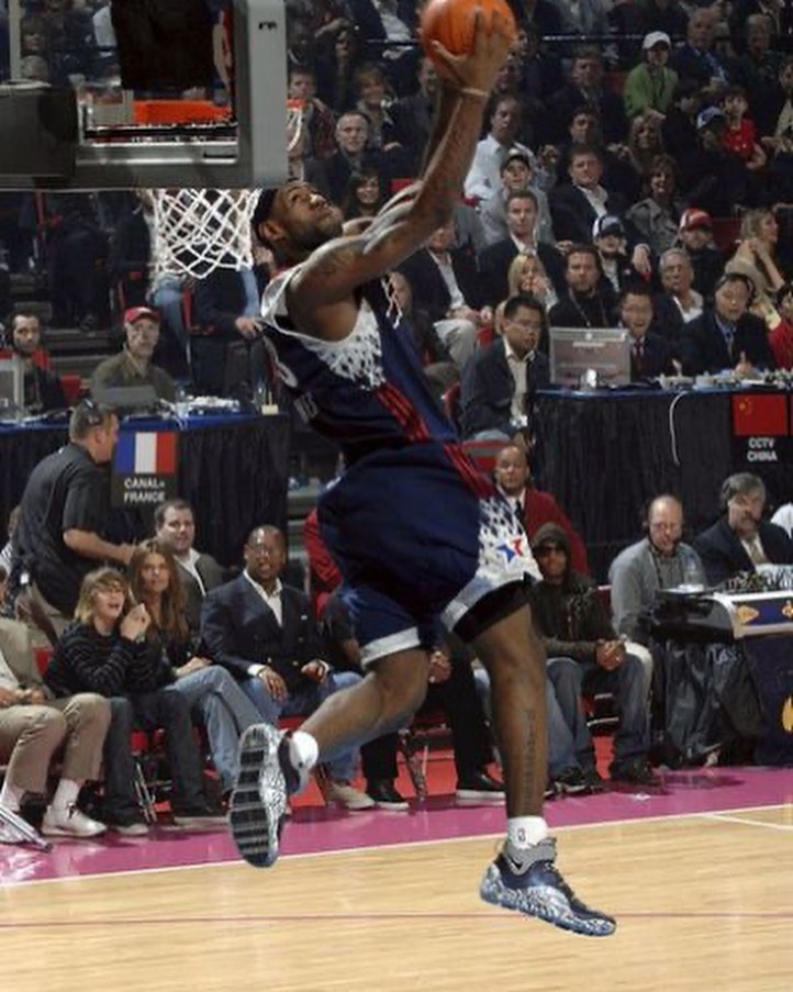 其实当年 Nike 就打造了两双涂鸦 LeBron 4 “Graffiti”,其中海军蓝配色在数量上比白色要更加稀有,詹姆斯在 2007 年的全明星赛中有过上脚,而这第二双涂鸦 LeBron 17 就是以此为配色灵感。
