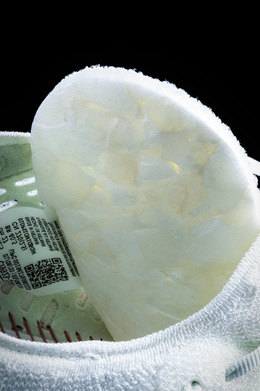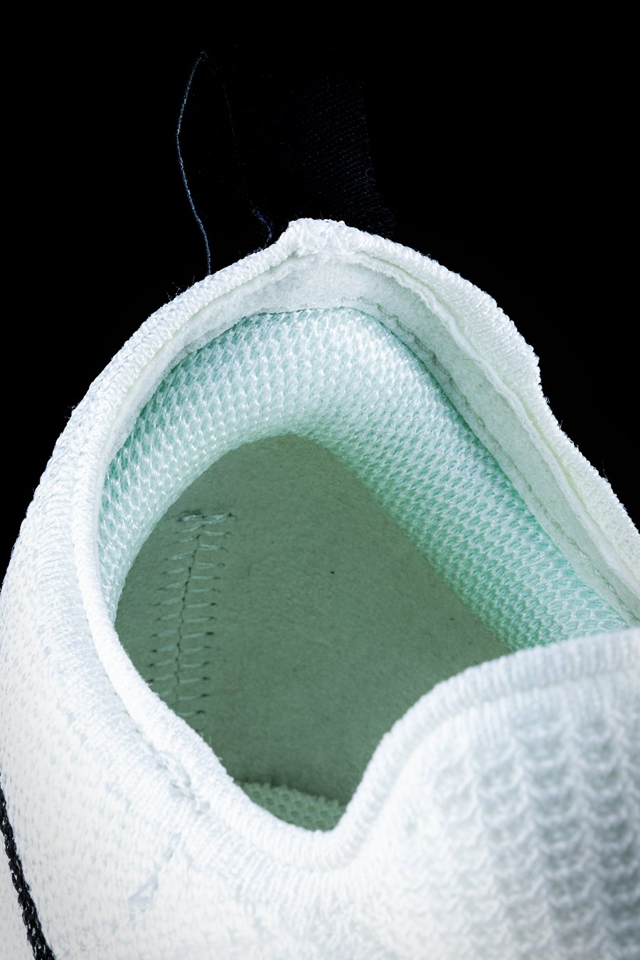 可通过图片看出,鞋面部分相对轻薄,鞋身中段透气性最为明显,而一体式鞋领则采用弹性织物打造。