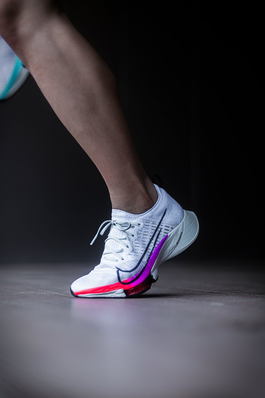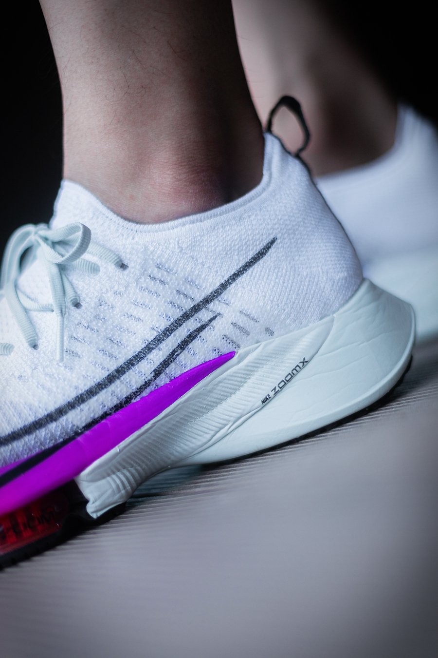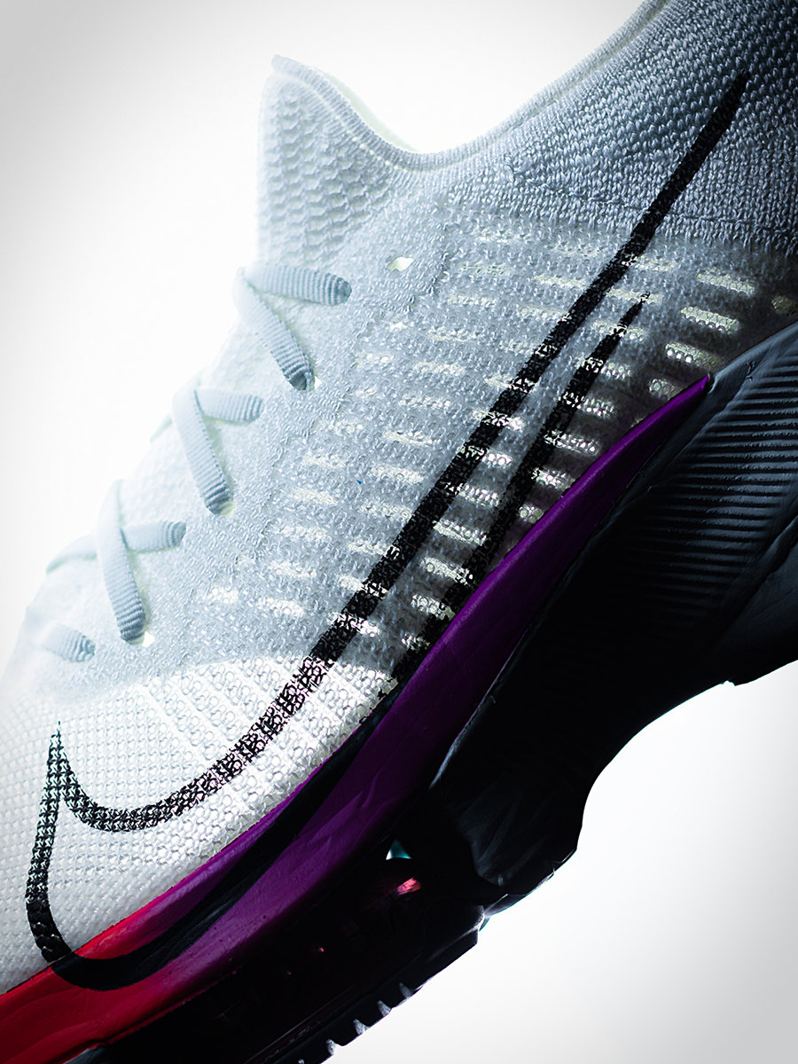 整体造型依然采用 Nike 跑鞋家族式的前尖后翘,但没有新旗舰 Nike Air Zoom Alphafly Next% 那般极限,相对有所收敛。
