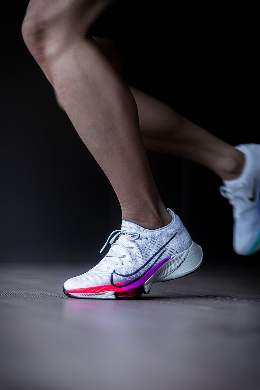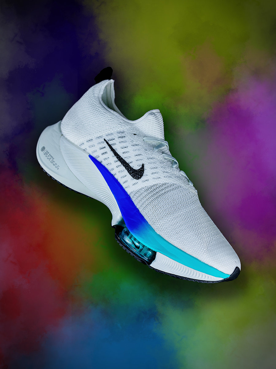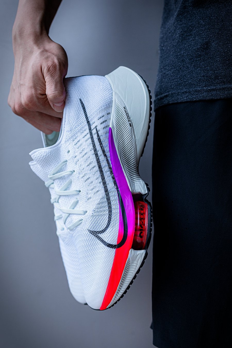 整体造型依然采用 Nike 跑鞋家族式的前尖后翘,但没有新旗舰 Nike Air Zoom Alphafly Next% 那般极限,相对有所收敛。
