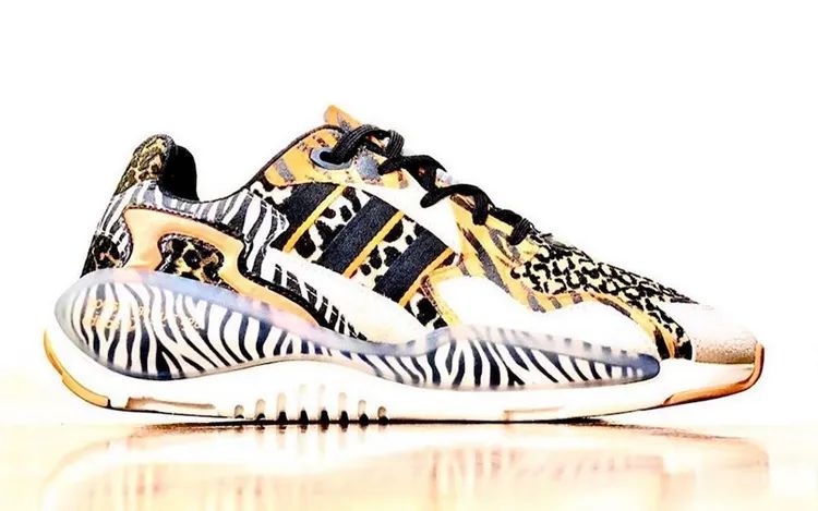 鞋身整体换上了 atmos 招牌的「动物园」配色,虎纹、豹纹、斑马纹等动物纹路皮革拼接的鞋身,尽显野性气质。