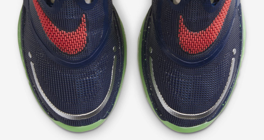 中底则以大面积白色泼墨装饰,搭配大面积荧光绿色外底以及前掌的红色,整体呈现出浓郁的科技气息与未来感。