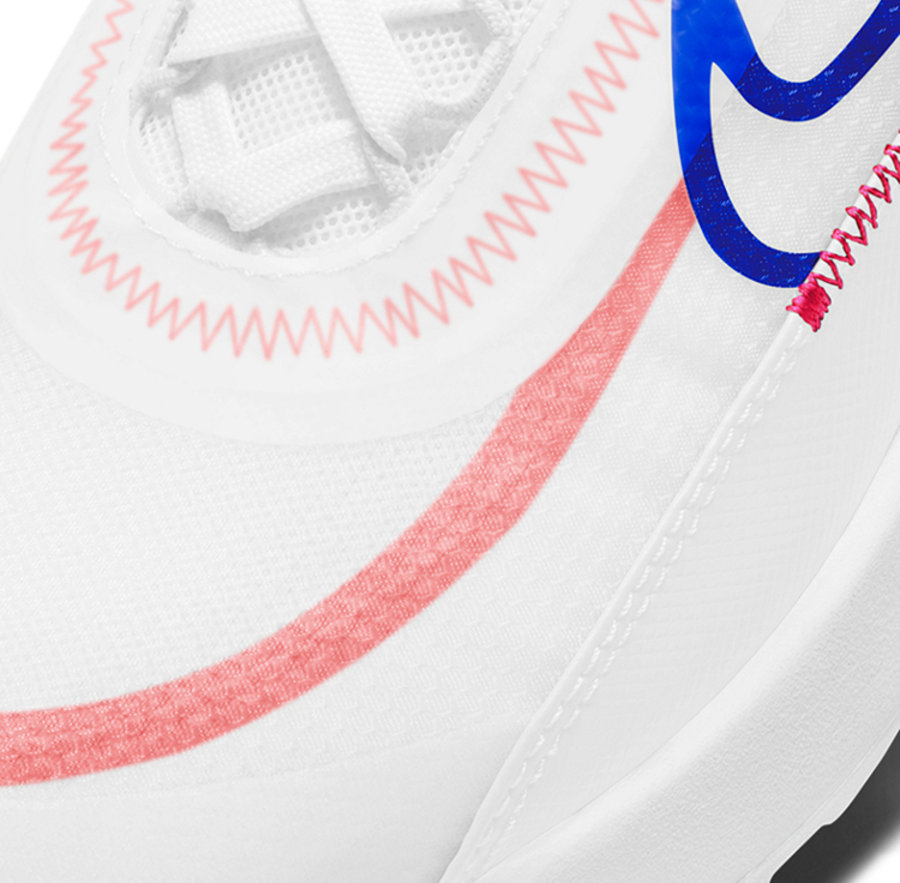 另一款配色以一袭白色打造鞋面,侧面蓝色镂空 Swoosh Logo 搭配红色车线点缀,吸睛效果十足。