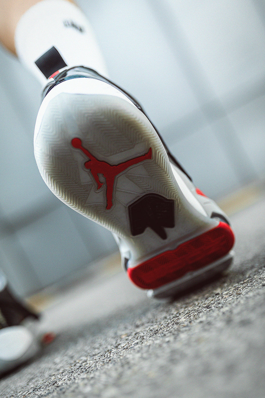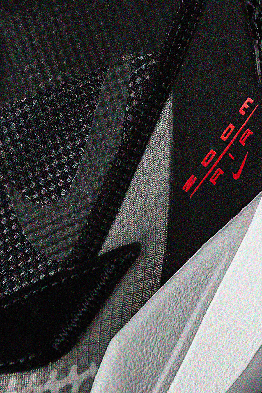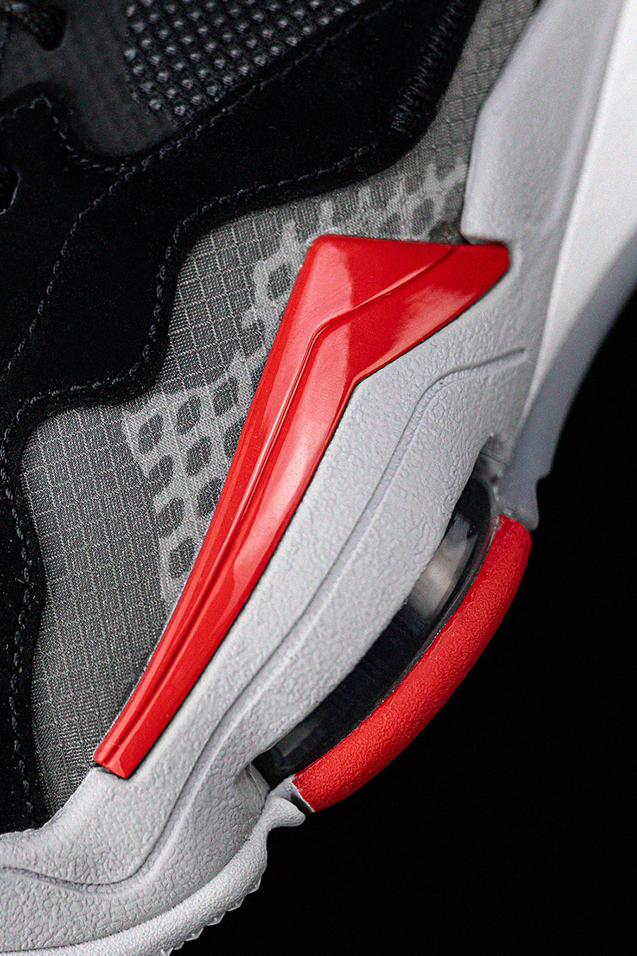 鞋舌采用黑色装扮,红色的飞人 Logo 点缀其上,黑红配色视觉冲击力超强。