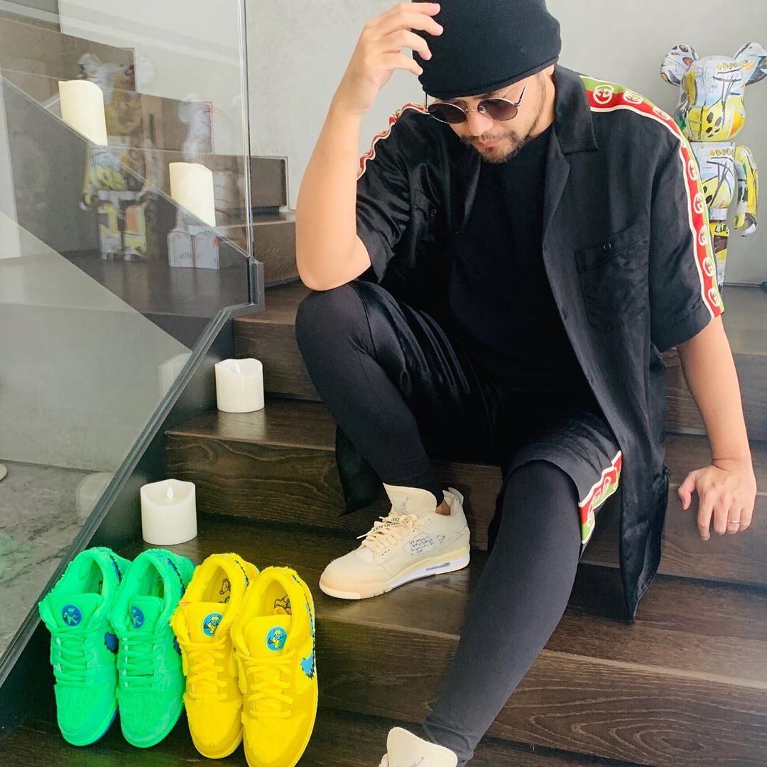 继前天抢先上脚 OFF-WHITE x Air Jordan 4 驰骋球场之后,昨天又晒出一张球鞋狠招,脚上依旧穿着 OFF-WHITE x Air Jordan 4,但照片中最大亮点还是黄色和绿色两双「小熊联名」Grateful Dead x Nike Dunk SB。