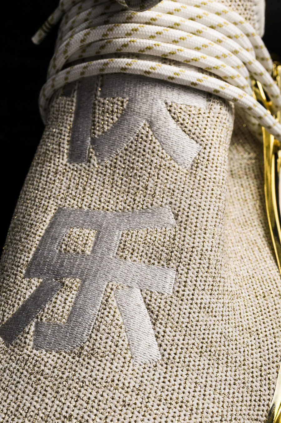 不同于市售版本的彩色,这双鞋以金线混织的鞋面搭配电镀金色 TPU 框架,金线华丽耀眼。