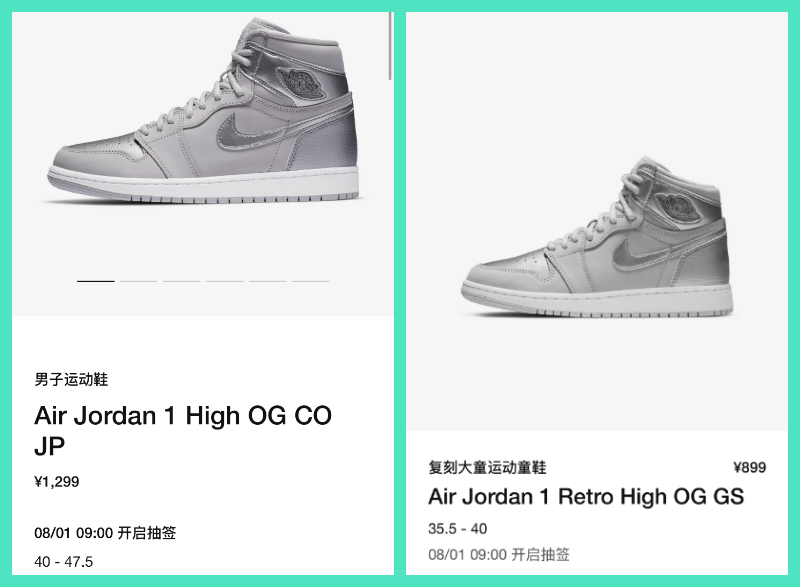 虽然无缘手提箱版本,但目前国区 Nike SNKRS 已释出常规版本预告,确定将于 8 月 1 日早 9 点携成人款及 GS 版本抽签发售,定价分别为 ¥1299 RMB 和 ¥899 RMB。