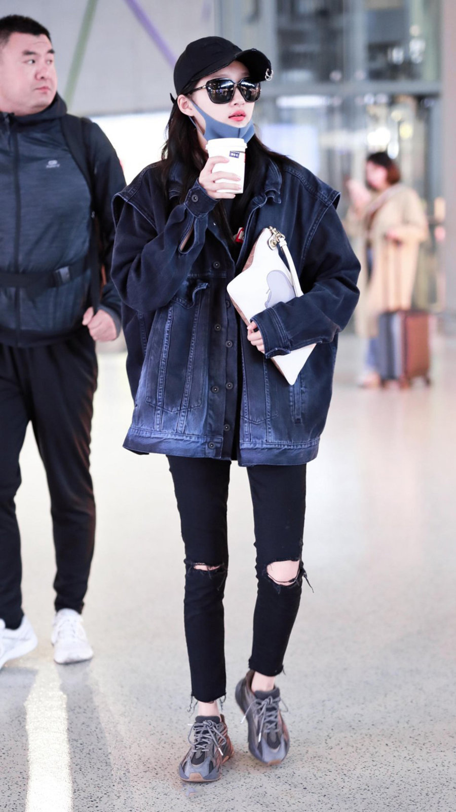关晓彤还上脚了 Yeezy 700 V2 “Geode”,搭配黑色拼接牛仔服和破洞牛仔裤,拉满潮流属性。