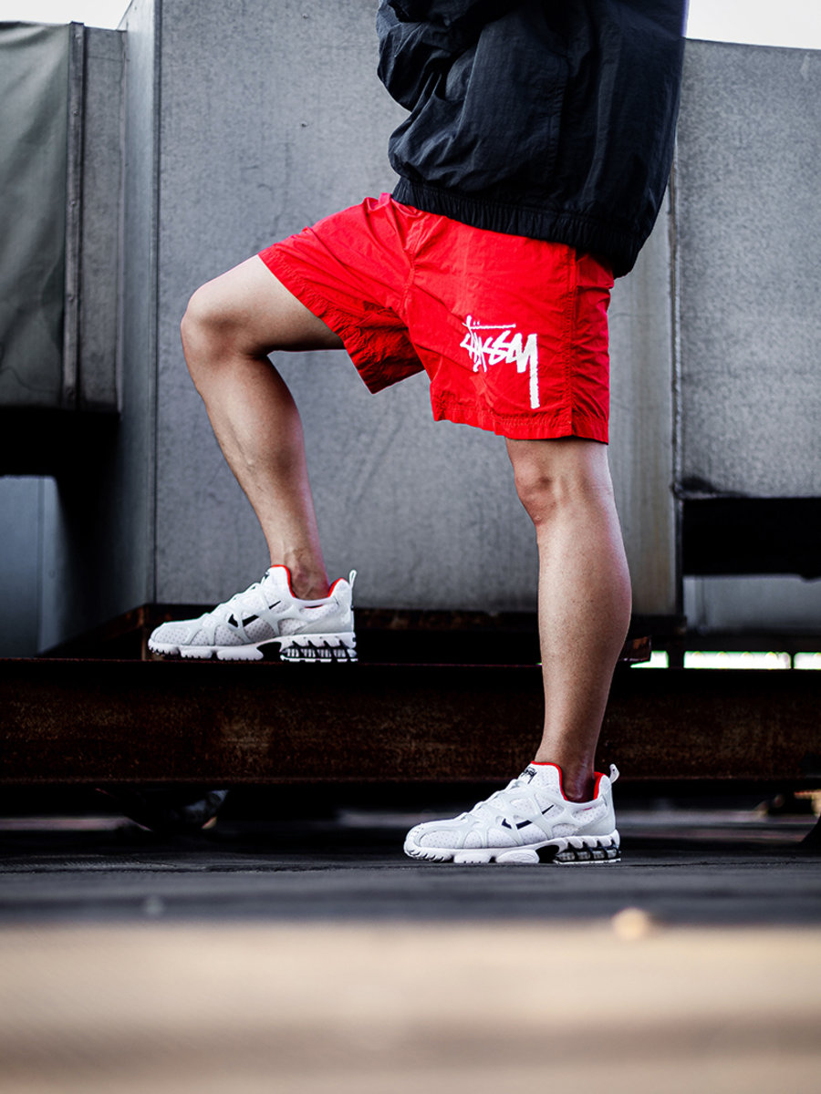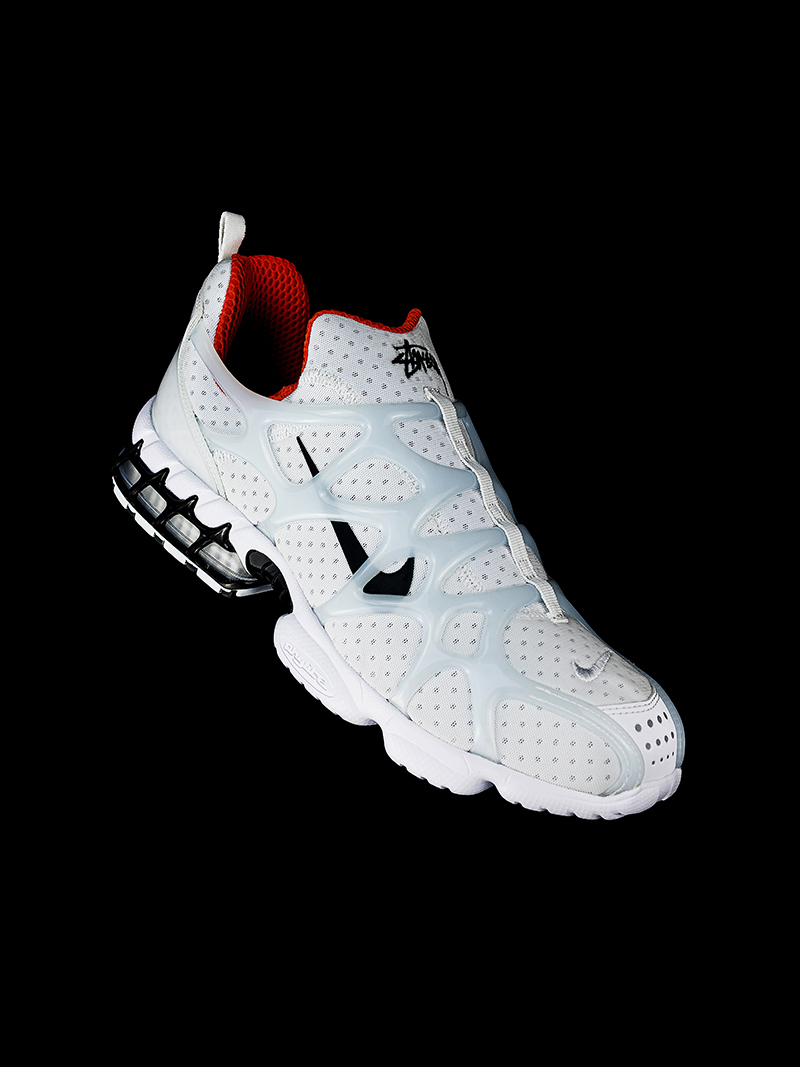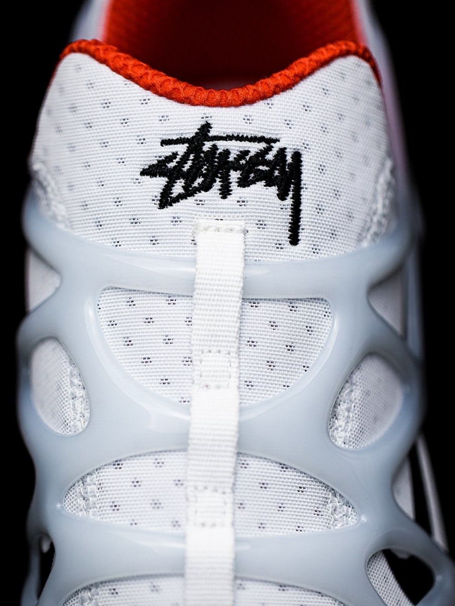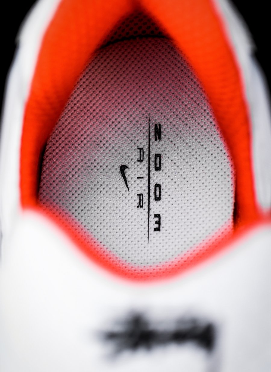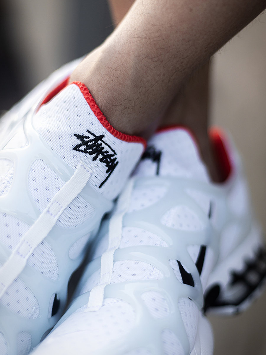 白色透气鞋面辅以鲜红色内衬示人,熟悉的黑色 Stüssy 手写 Logo 点缀于鞋舌部位。