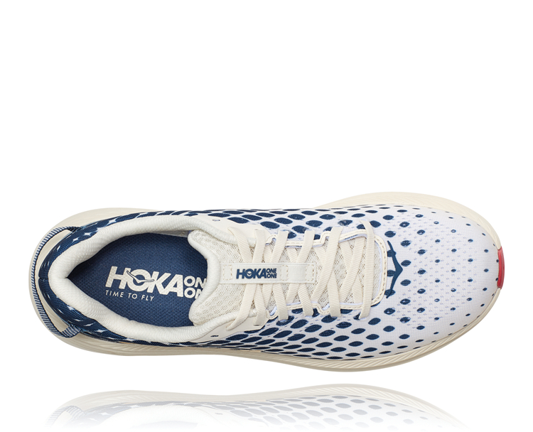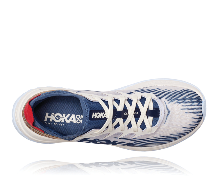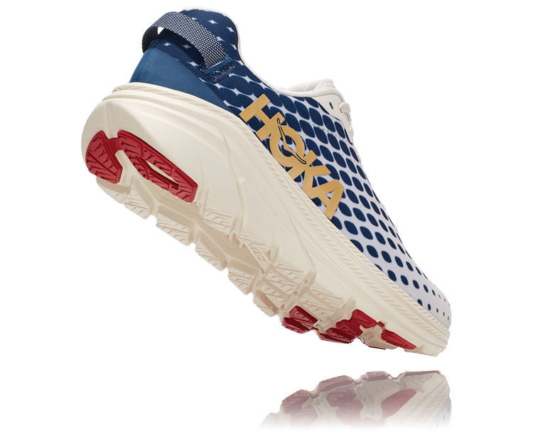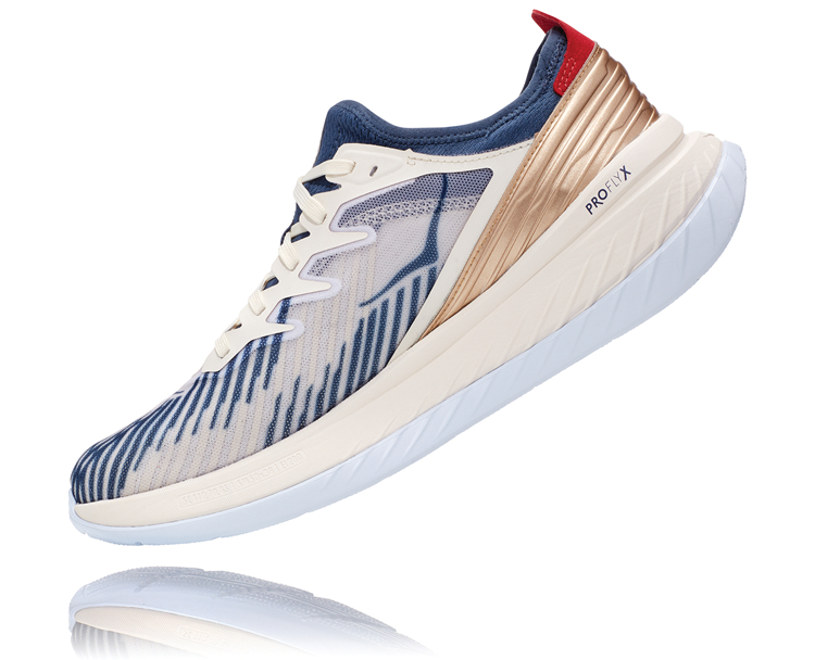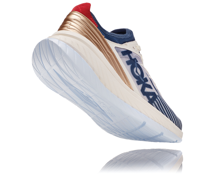第一款运动鞋为 Carbon X SPE,鞋面以白色为主调打造,同时搭配蓝色条纹点缀,鞋身侧面印有 HOKA Logo 并采用蓝色呈现,整双鞋色调极其统一。