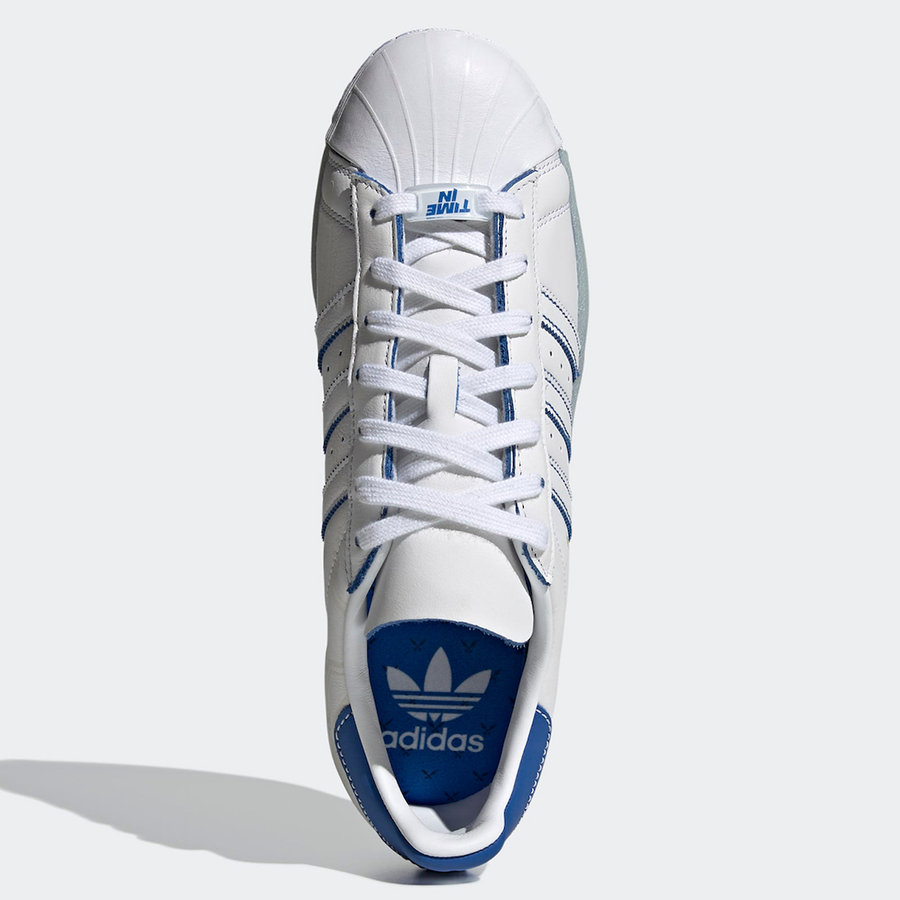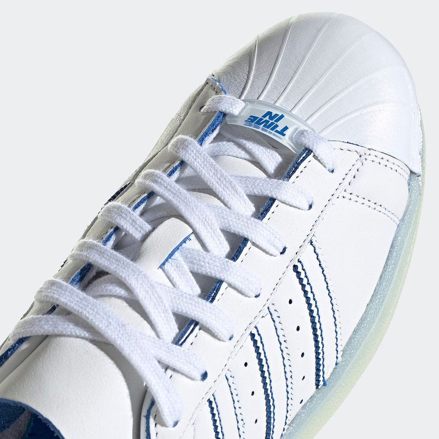 整双鞋在大面积的白色基础上加入蓝色点缀,经典贝壳头与鞋面都以质感出众的皮革材质打造,专门设计的特殊鞋带扣上有 “Time In” 字样,再加上鞋身上的烫金 “NINJA” 标志都象征联名身份。