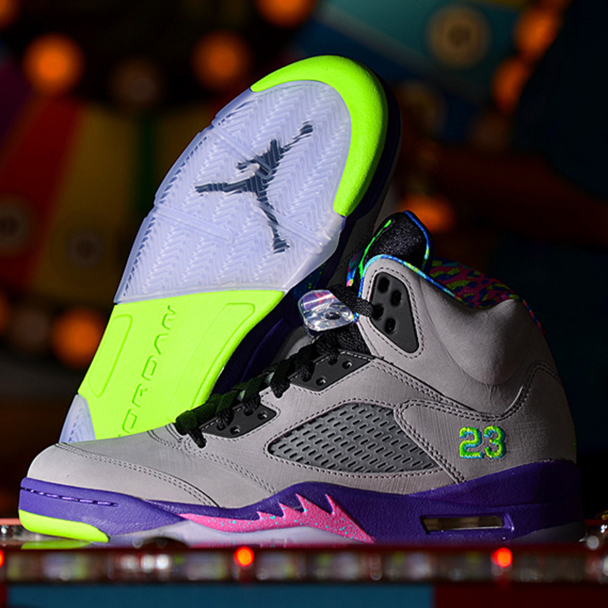 内衬采用多彩色块拼接打造,同时鞋舌与后跟的 Jumpman Logo、中底火焰涂装、外底色调均辅以不对称的鸳鸯设计示人,重现威尔·史密斯在剧中穿搭的鲜明个性!