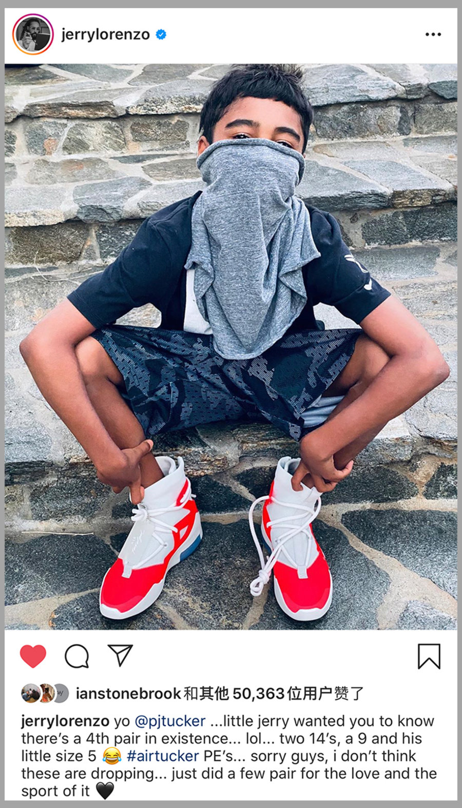 就当我们还在猜测何时发售时,Fear of God 主理人 Jerry Lorenzo 在个人社交媒体上也分享了这款新品,并称其为 Air Tucker PE 。