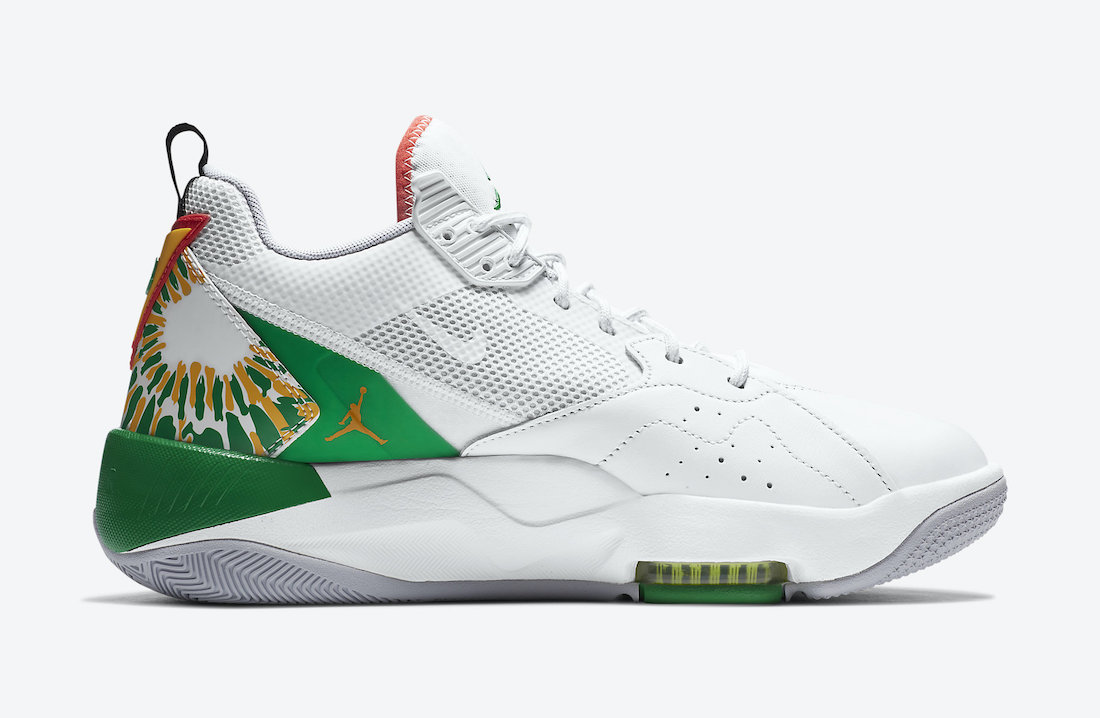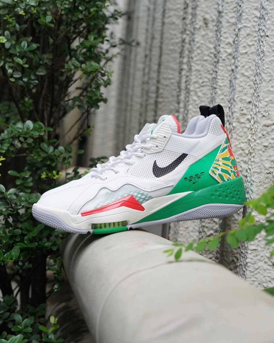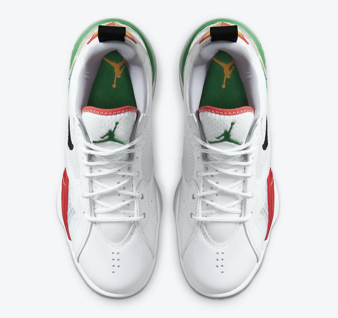 鞋面采用白色为主体,搭配红、绿、黄点缀,颇有些牙买加配色的感觉。