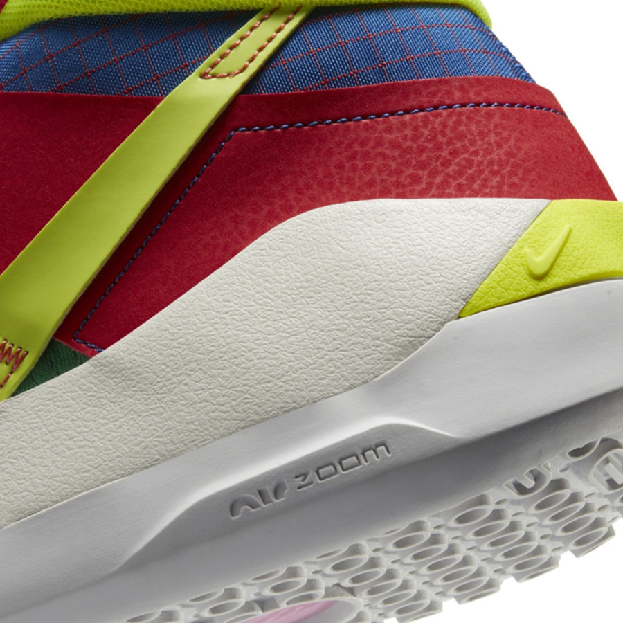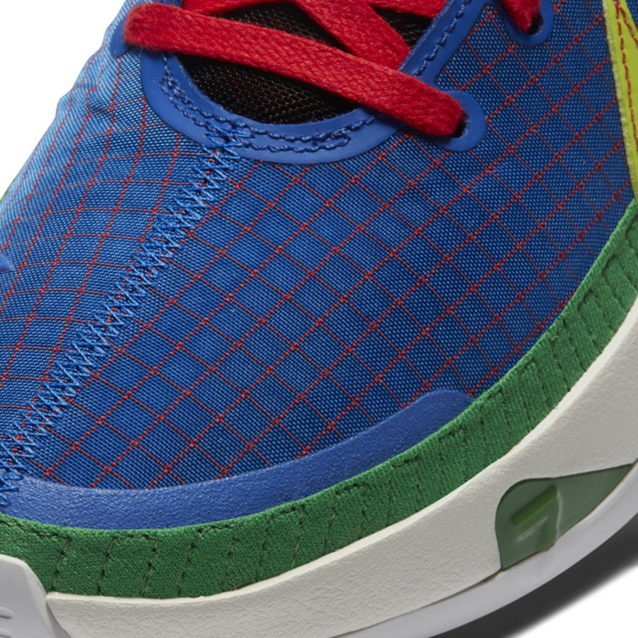 鞋面以蓝色为主调同时搭配红色网格点缀,侧身 Swoosh Logo 则以黄粉两色拼接呈现,吸睛效果十足。