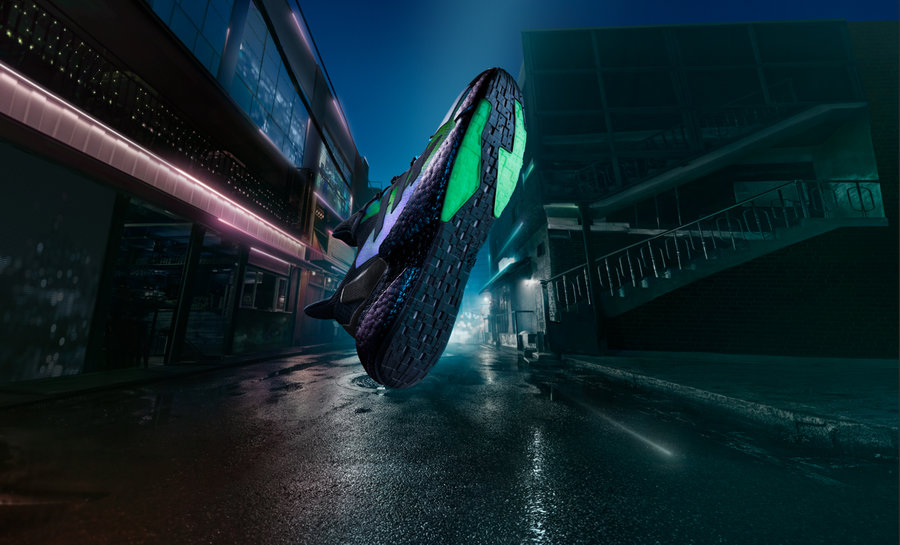 鞋面两侧热固橡胶充盈绿色荧光,中底两侧泛着幽蓝色光泽,整体呈现出迷幻色调。
