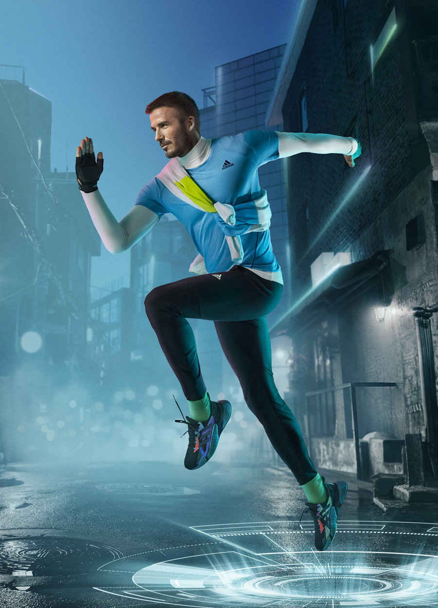 贝克汉姆率先上脚黑色款 adidas X9000 L4 跑鞋,以黑色为主调,辅以炫彩色调的材质。
