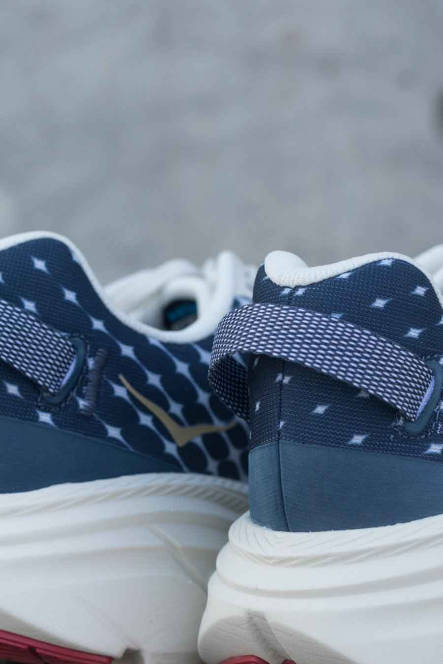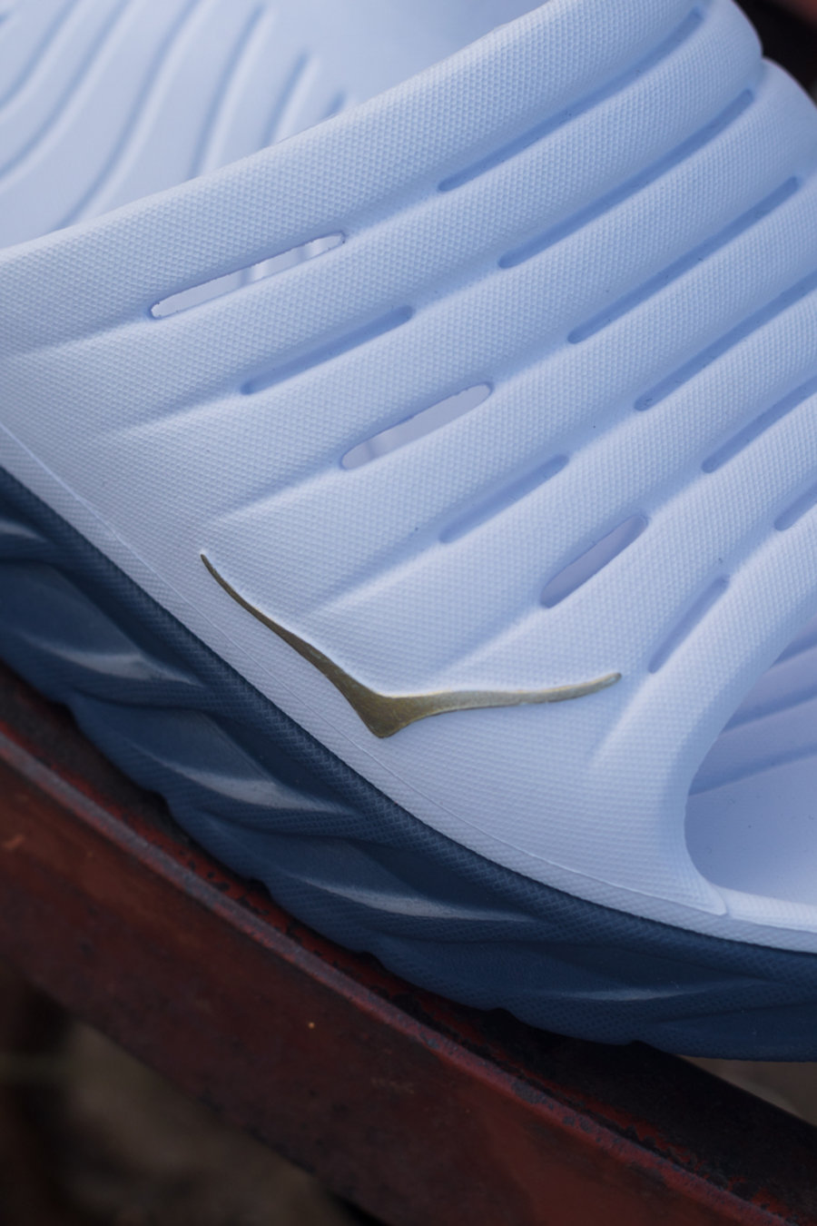 白蓝色主调的鞋面注入深蓝色细节,搭配金色 HOKA 字样点缀,视觉极为抢眼。