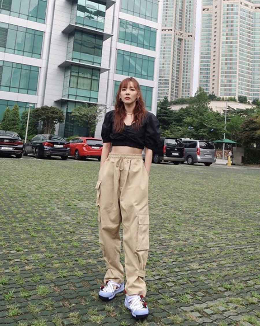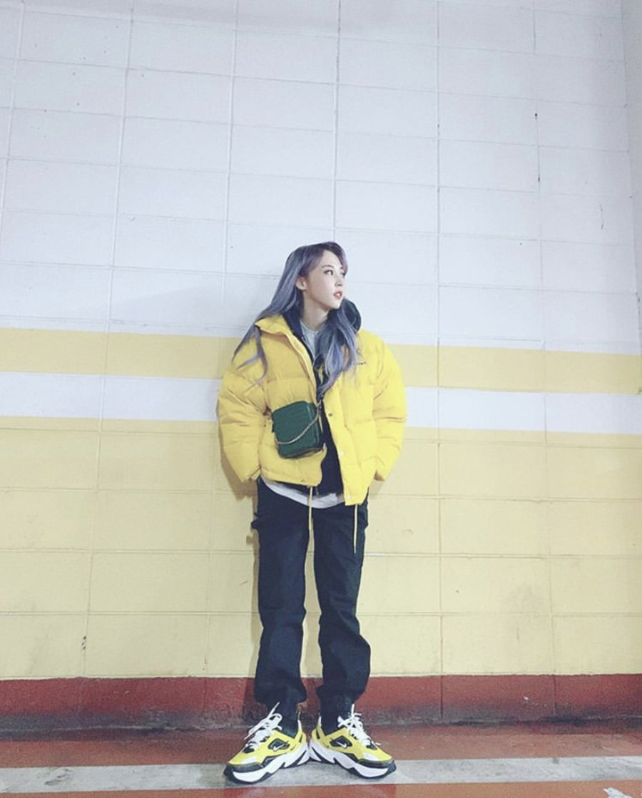 搭配黄色短款羽绒服和黑色运动束脚裤,不愧是女团中 Cool Girl 的代表!