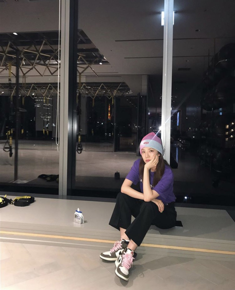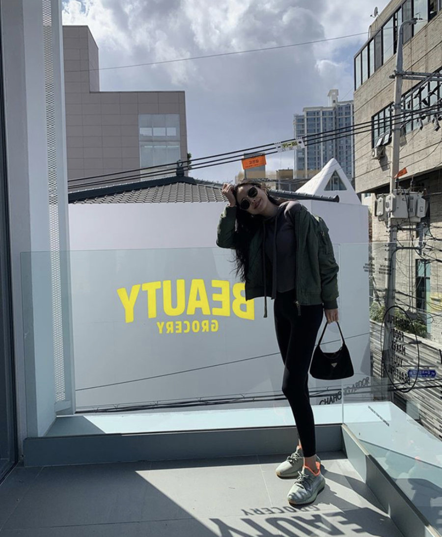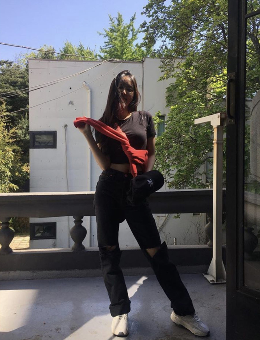 身着黑色短款 T 恤的孙娜恩上脚 Yeezy Boost 700 V2 “Analog”,搭配破洞拼接牛仔裤 ,若隐若现的马甲线运动且性感。