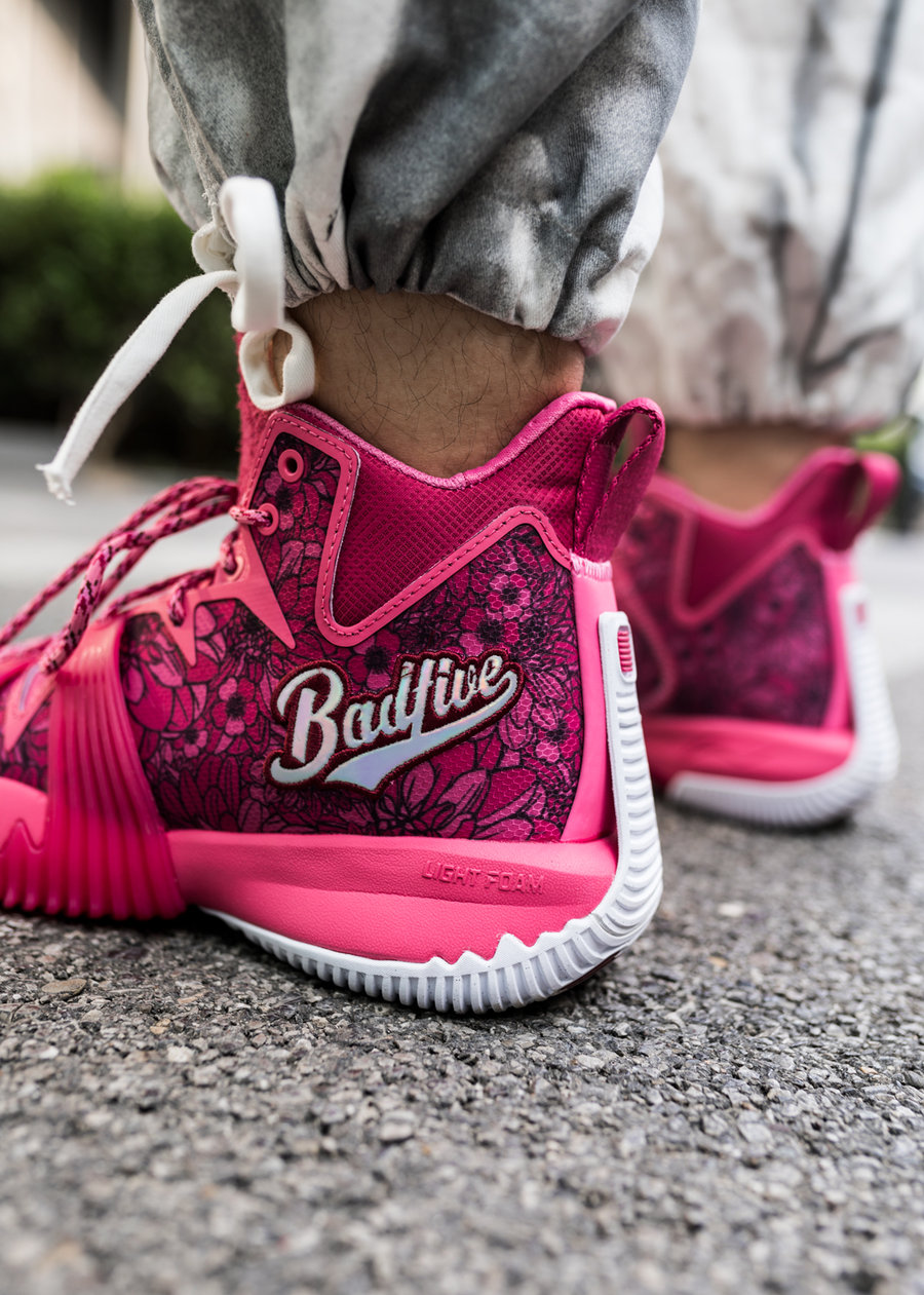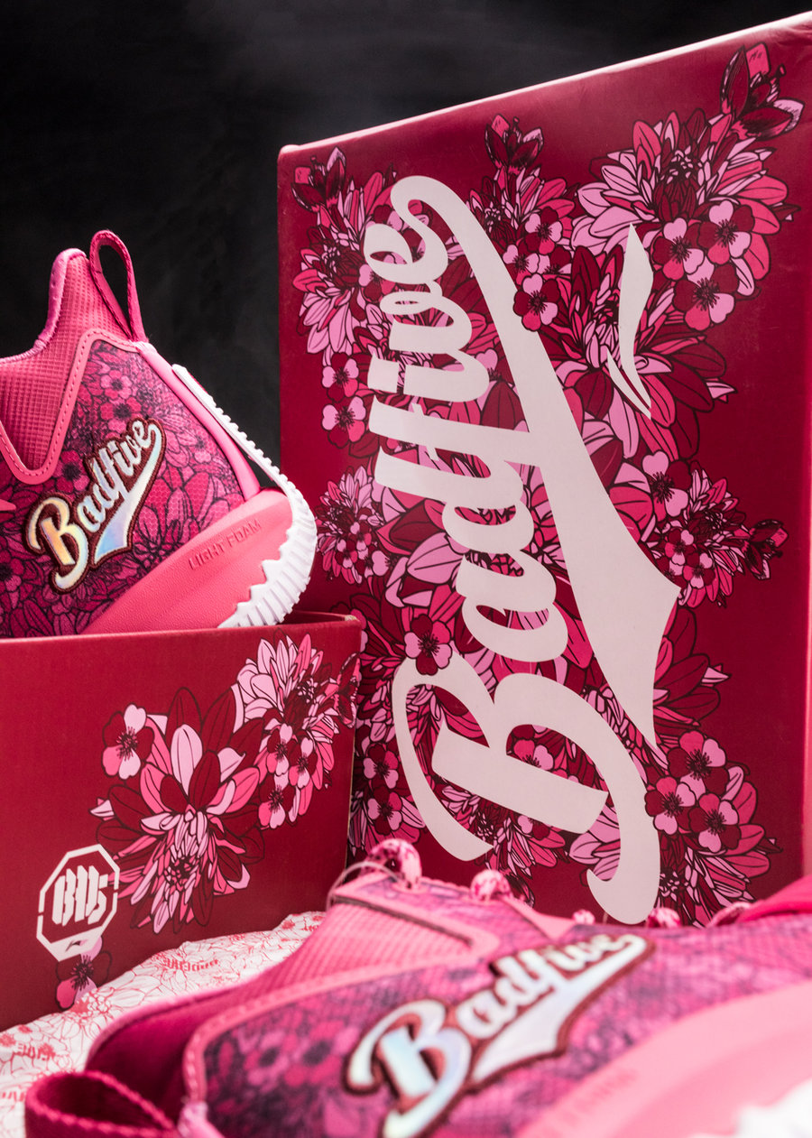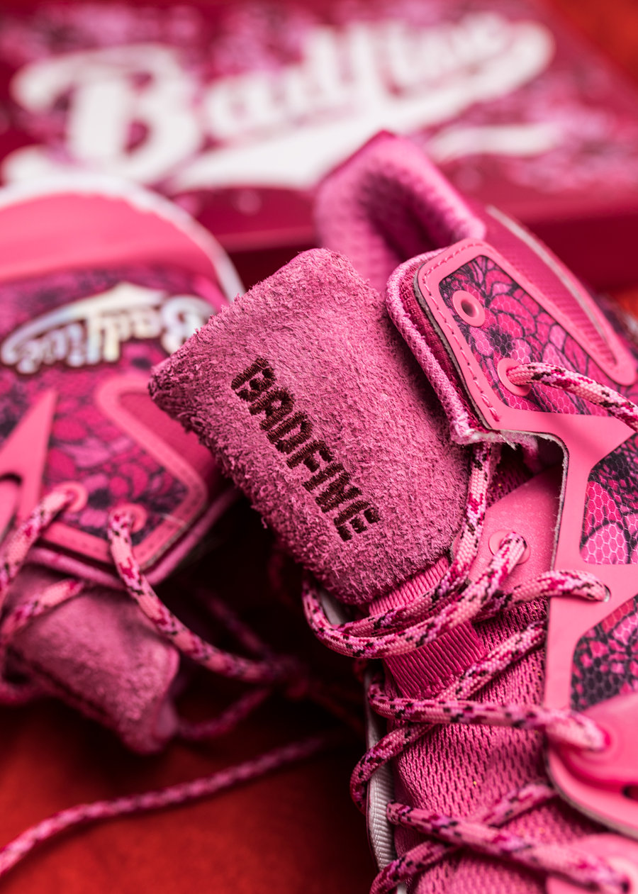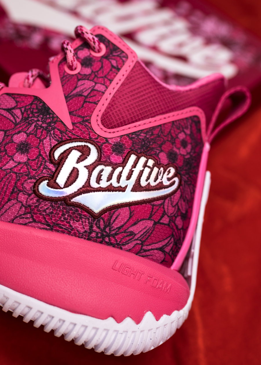 还有鞋帮下方,标志性的 Badfive 花体字装饰,亮银色反光材质打造,与鞋身样式风格非常搭调。