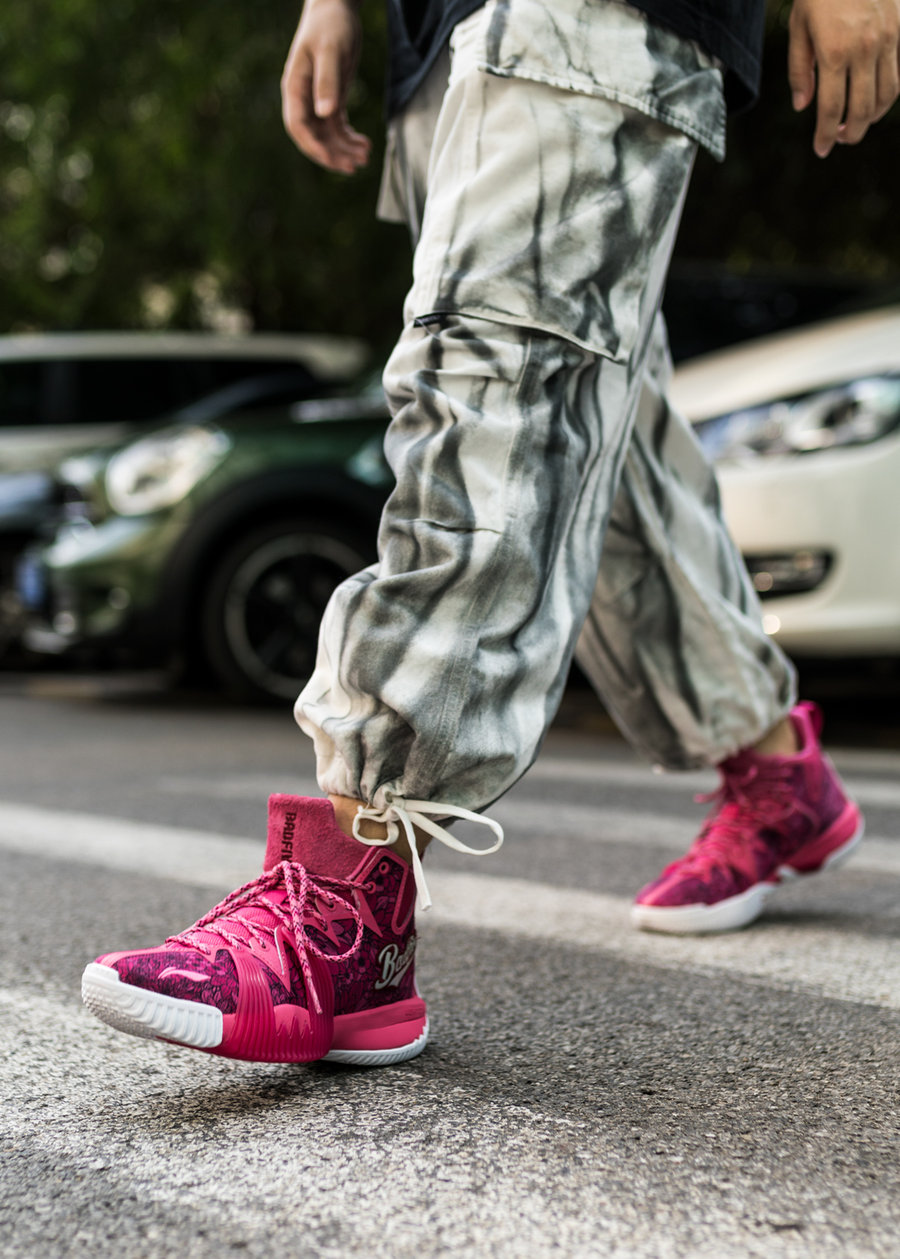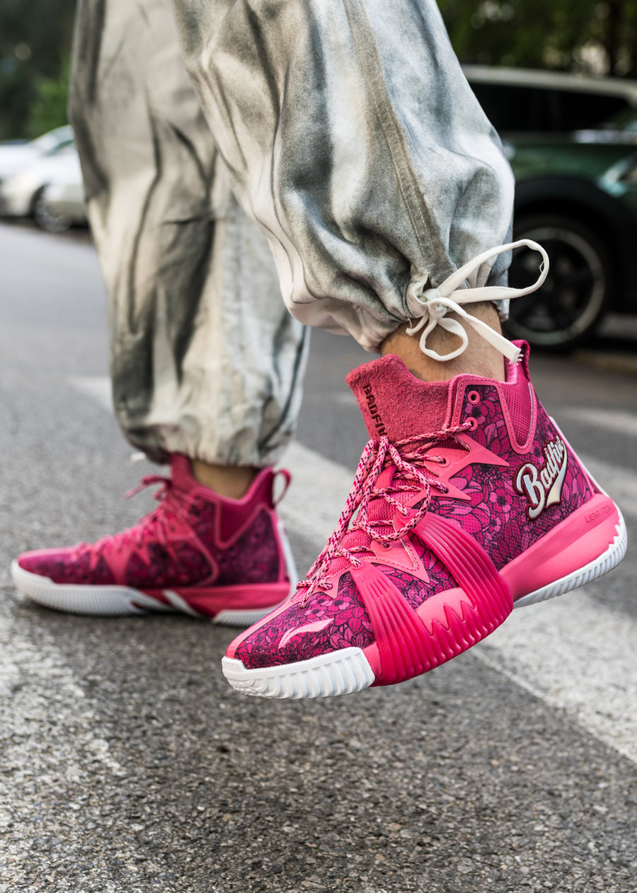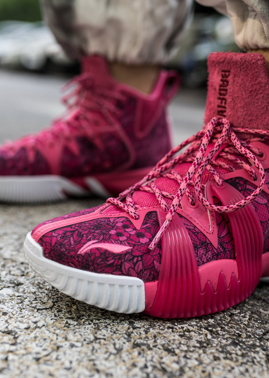 鞋身各处都以粉色装扮示人,鞋头 Li-Ning Logo 以细腻粉色刺绣呈现,侧身防侧翻支撑也是粉色半透明材质打造。