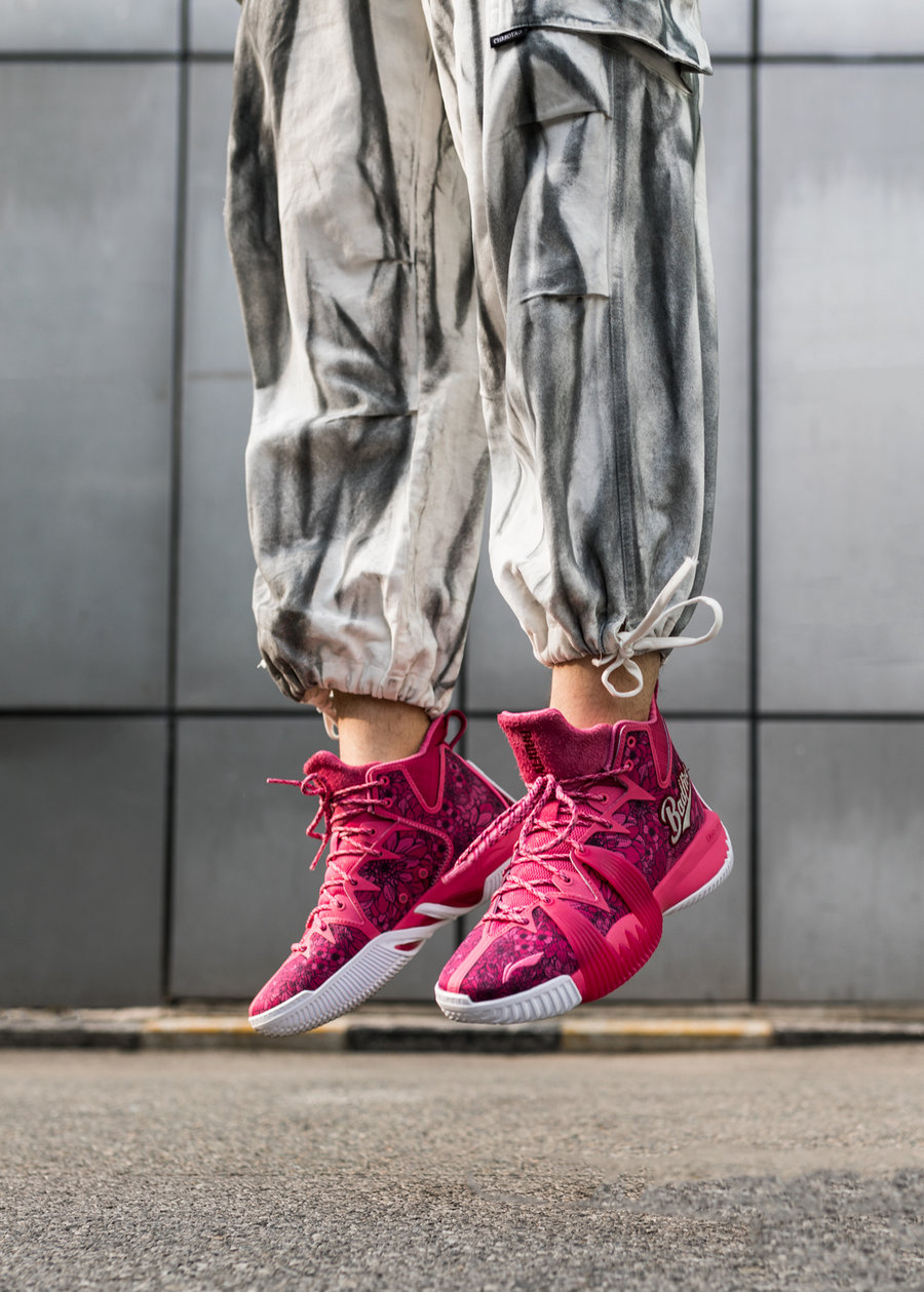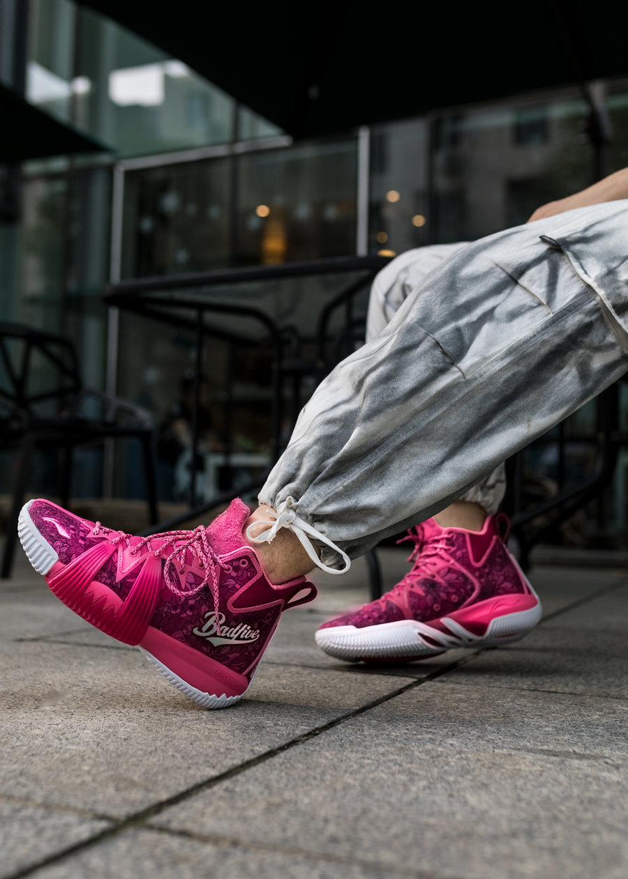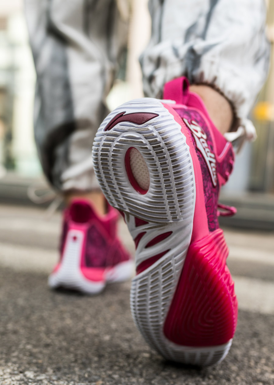 鞋身各处都以粉色装扮示人,鞋头 Li-Ning Logo 以细腻粉色刺绣呈现,侧身防侧翻支撑也是粉色半透明材质打造。