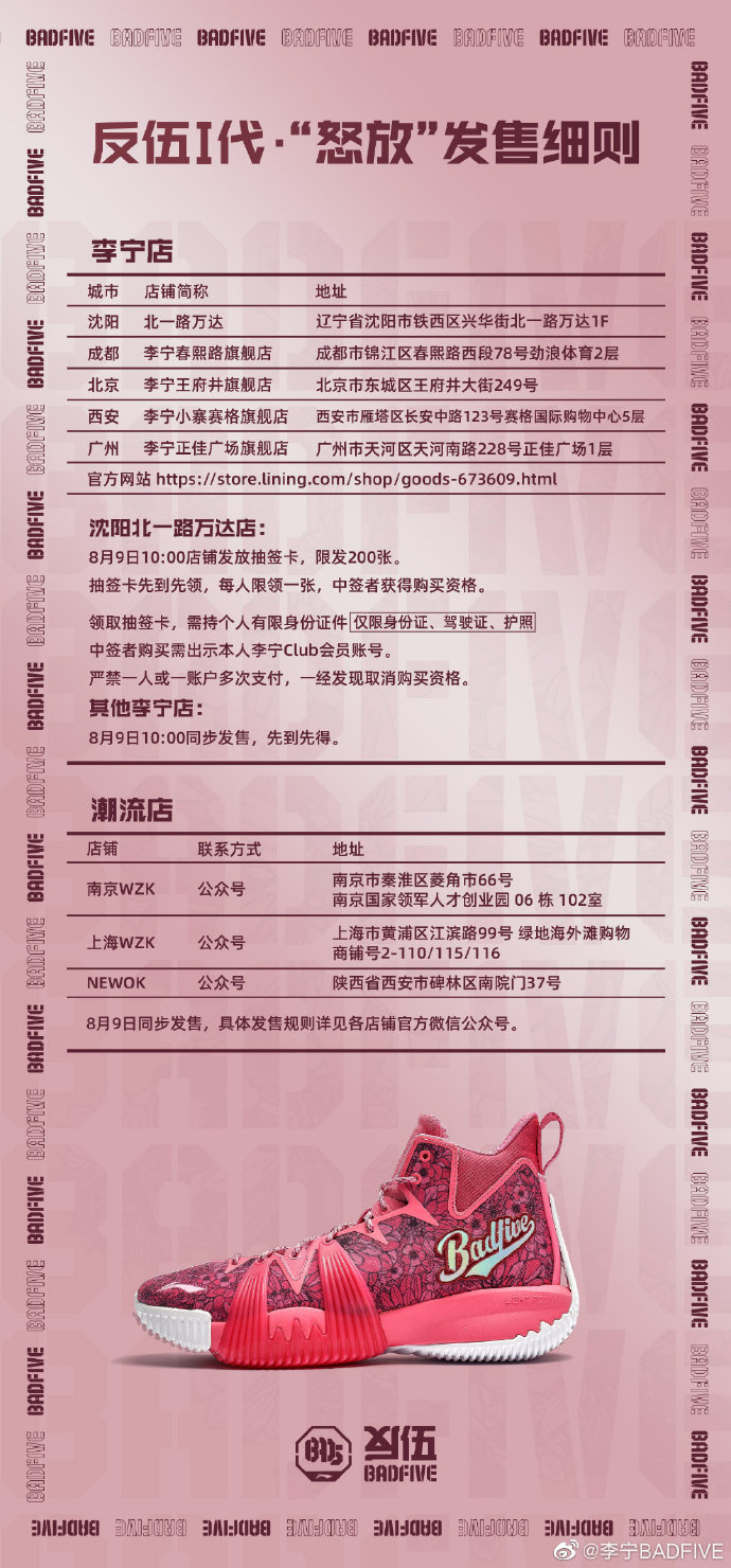 李宁反伍一代 “怒放”将于 8 月 9 日在李宁店和潮流店发售,售价 ¥999 元。感兴趣的小伙伴可以参看下方细则,做好入手准备。