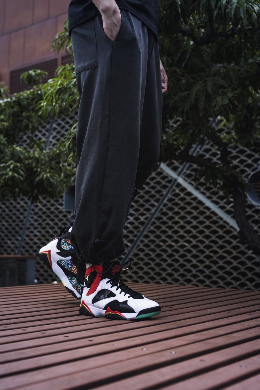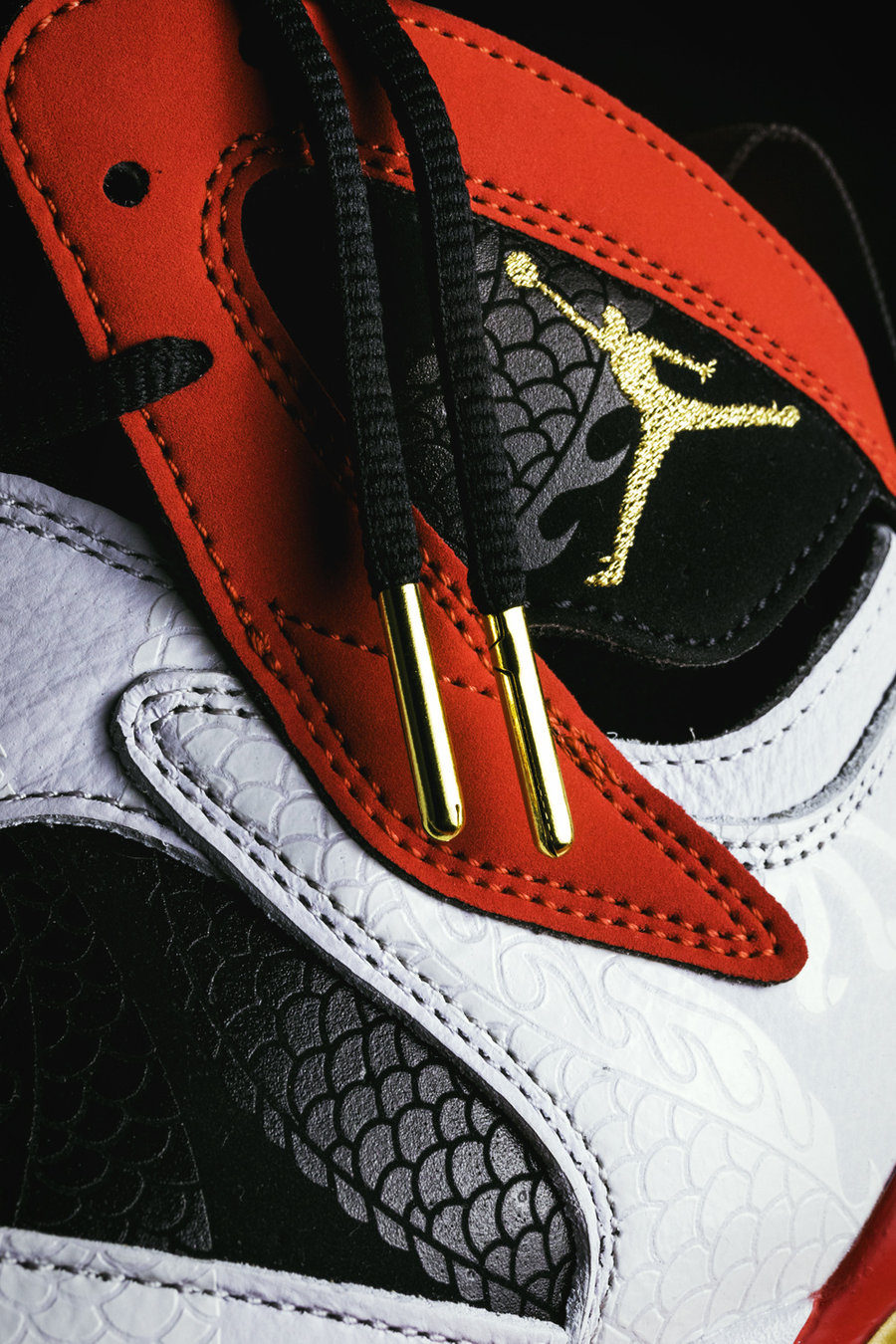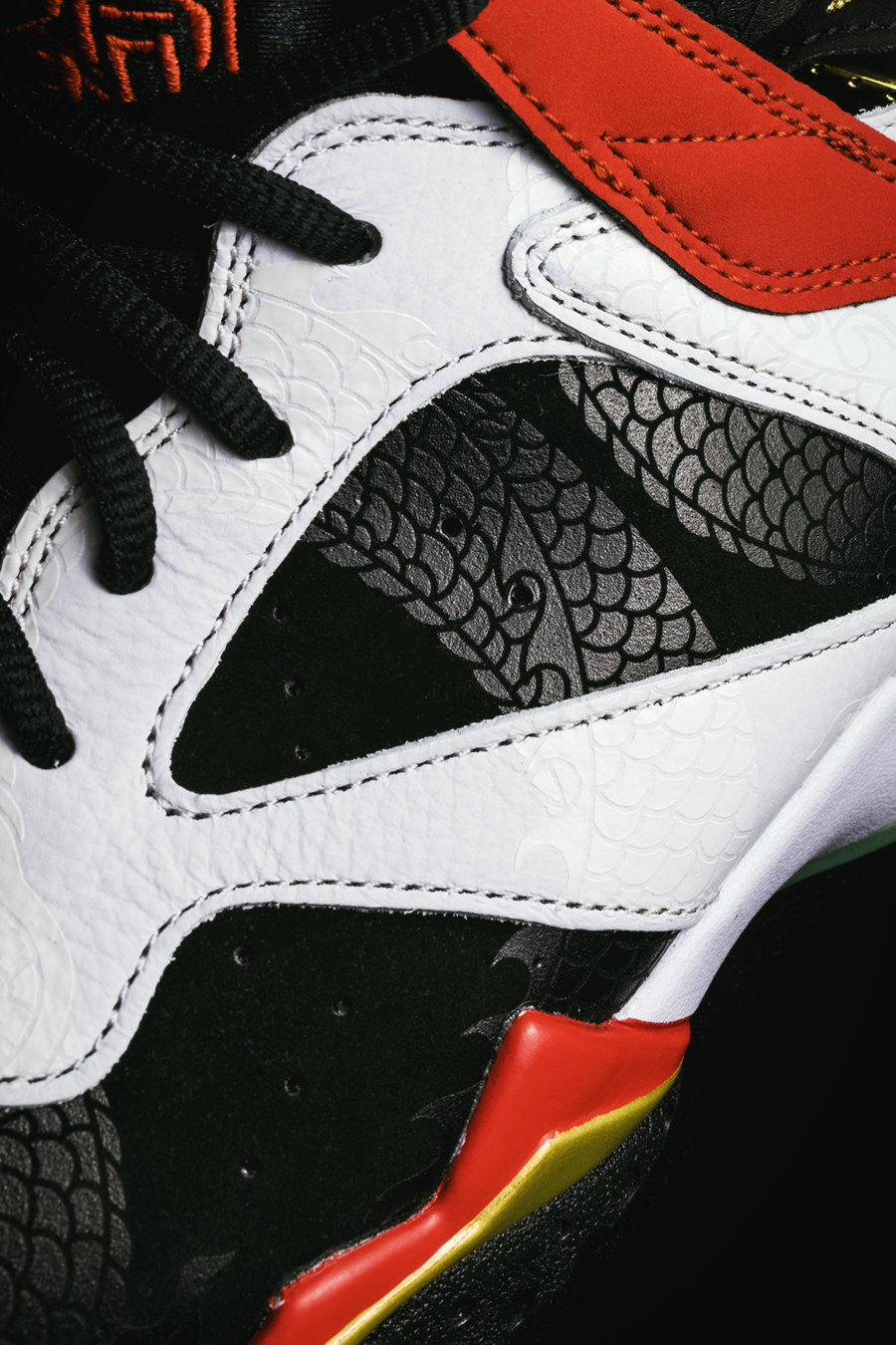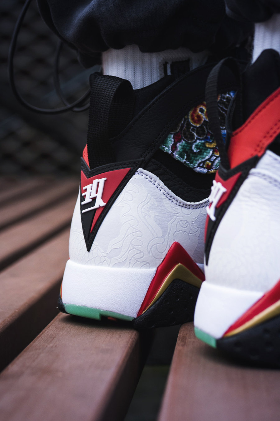 以乔丹 92 年征战奥运的 Air Jordan 7 为蓝本,融入中国韵味的黑白红金配色装扮。