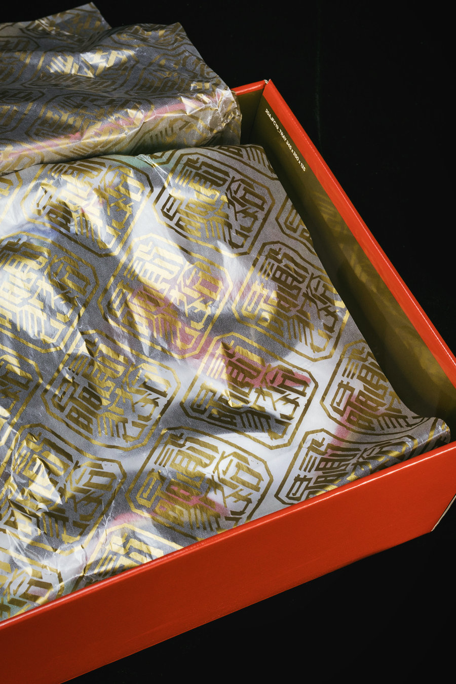 打开鞋盒后,特别打造的半透明衬纸,铺满金印更显奢华。