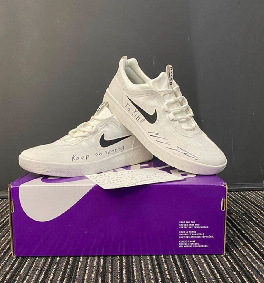 王一博近期不仅上脚 Nike SB Nyjah Free 2,还在 Instagram 晒出了自己收到的美国职业滑手 Nyjah 的签名球鞋礼物。
