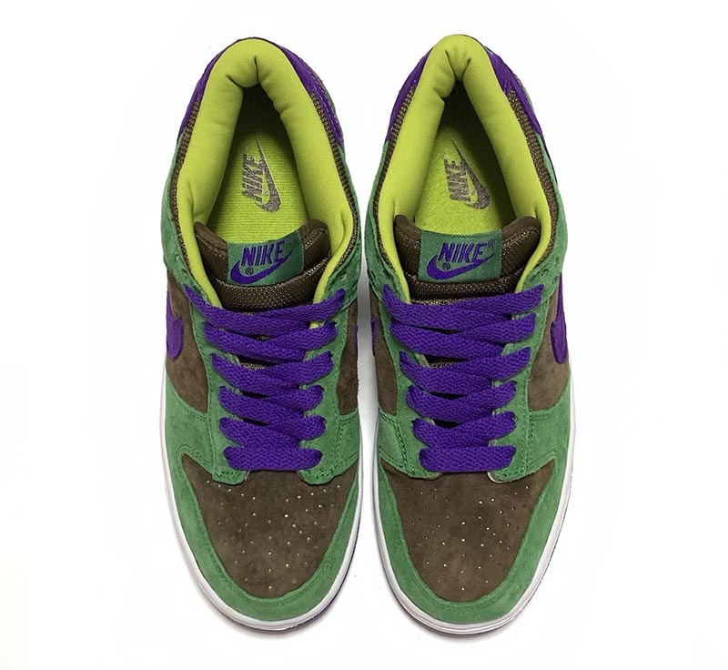 近日网络再度浮现即将复刻的实物图片,整体鞋身采用棕色与绿色拼接呈现,搭配紫色 Swoosh 与鞋带,在 2010 年发售的臭鼬配色 Nike Dunk SB Hi “Skunk 420” 上,也能看到这双鞋的影子,相当经典。