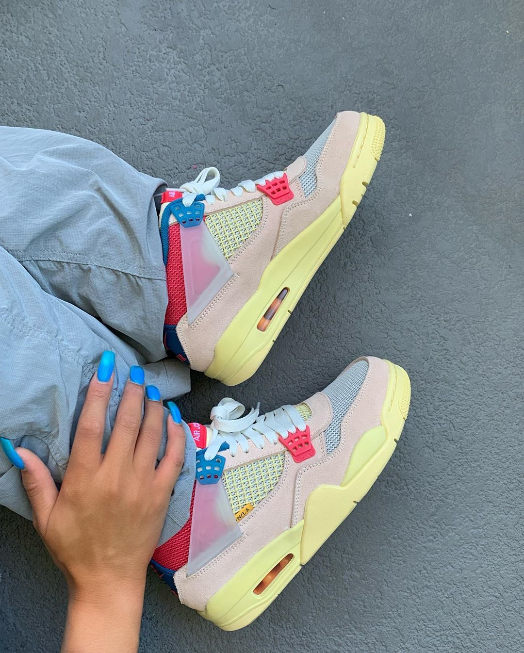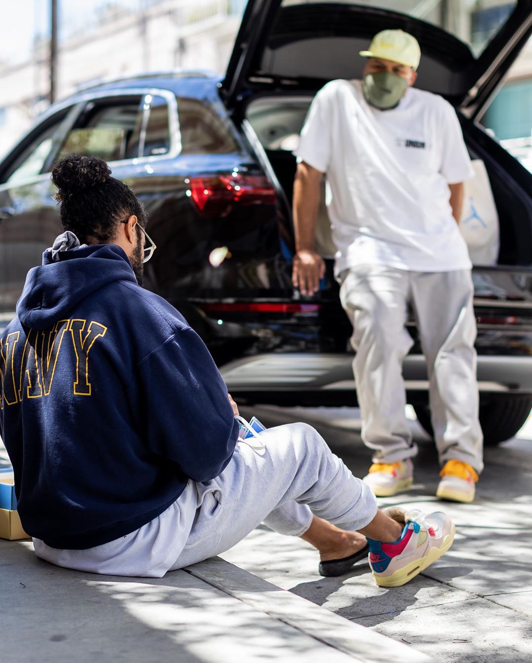 他上脚的是浅色款 Air Jordan 4,辨识度非常高,拼色鞋帮能让人一眼就认出是 Union LA 的联名。