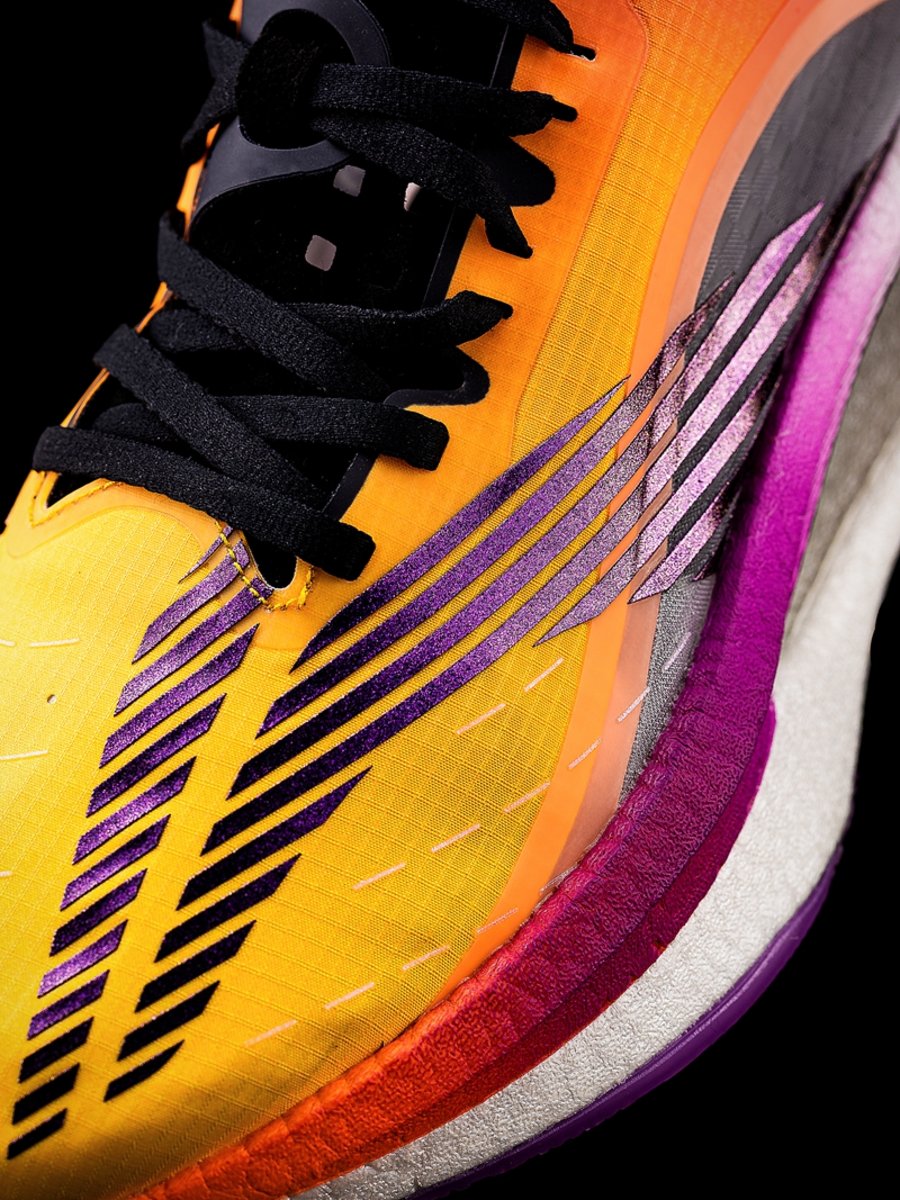 整体色调不仅采用彩虹渐变示人,鞋头的李宁 Logo 还特别以类似残像的幻彩光泽呈现,营造与绝影名称相匹配的速度感。