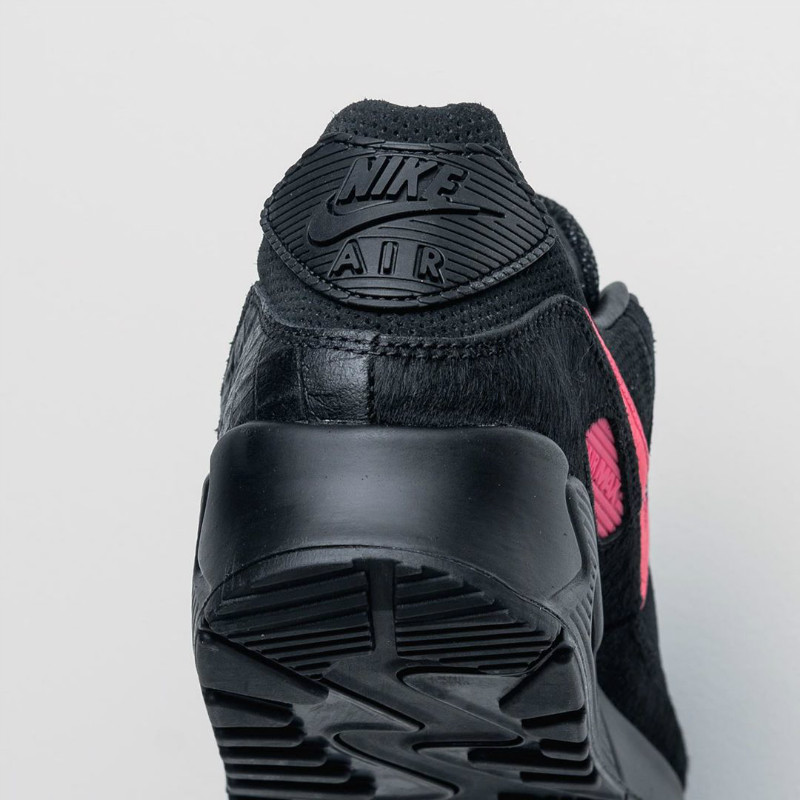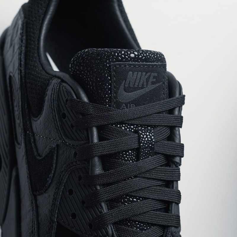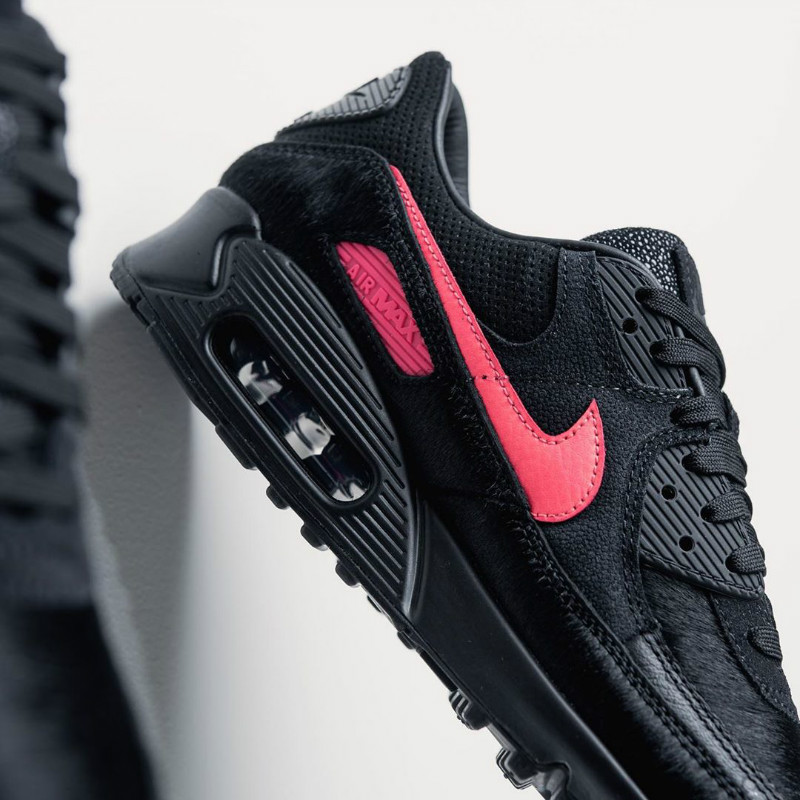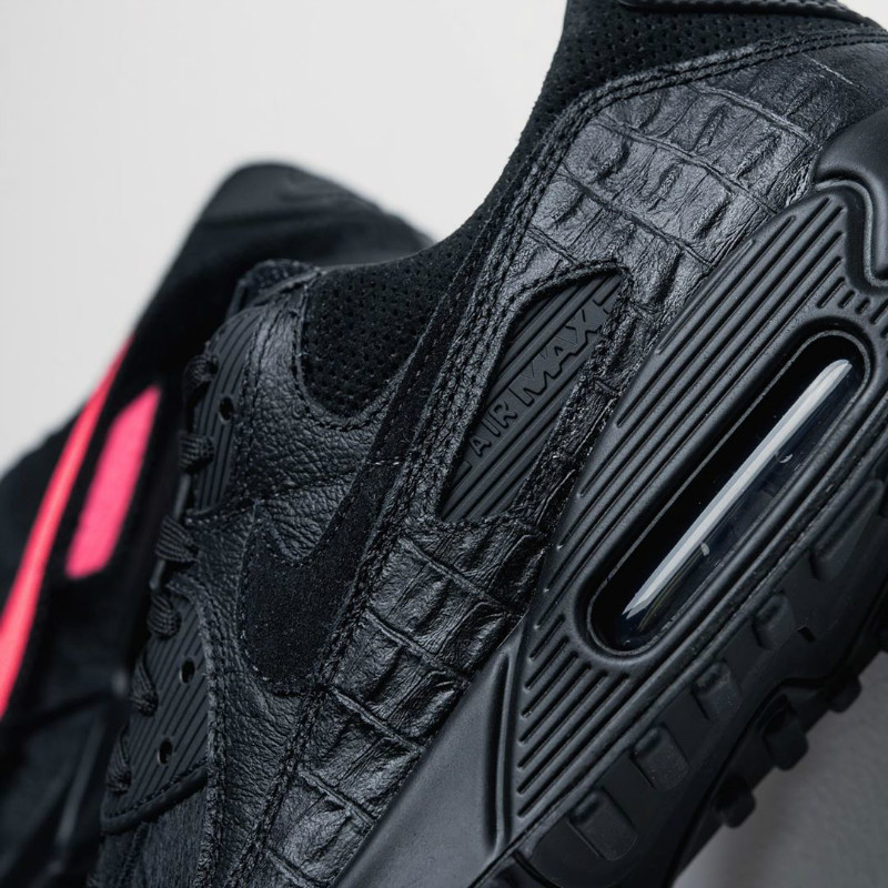 以 Air Max 90 为蓝本,鞋身分别以鳄鱼皮、魔鬼鱼皮、鸵鸟皮、马毛等稀有纹理呈现,搭配一袭酷黑的犀利装扮,狂野气质十足。