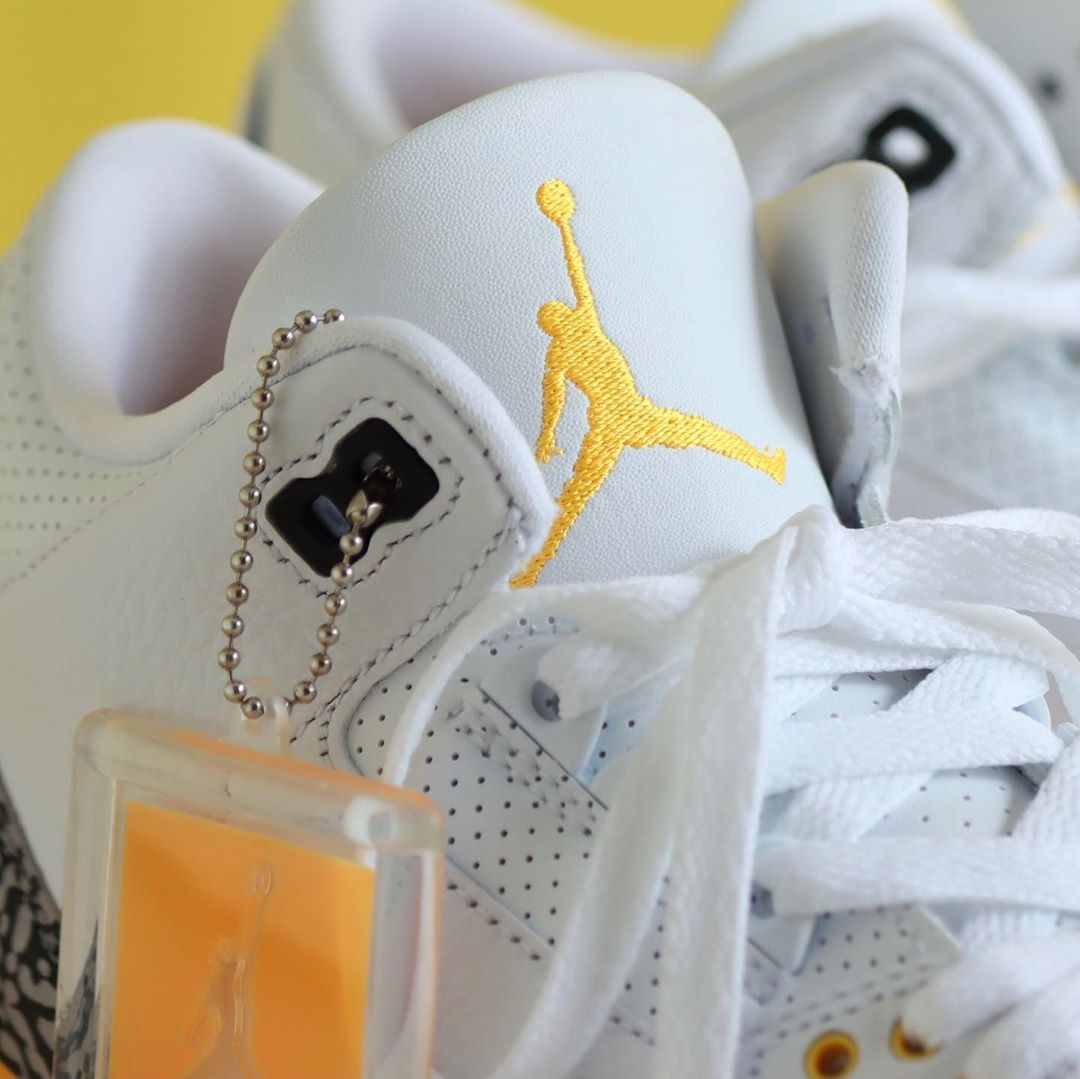 后跟位置点缀黄色,鞋舌上的 Jumpman Logo 同样采用黄色点缀,令人想起洛杉矶湖人队的主题配色之一,因此被称为湖人 Air Jordan 3,如果整体再加入一些紫色就堪称完美。