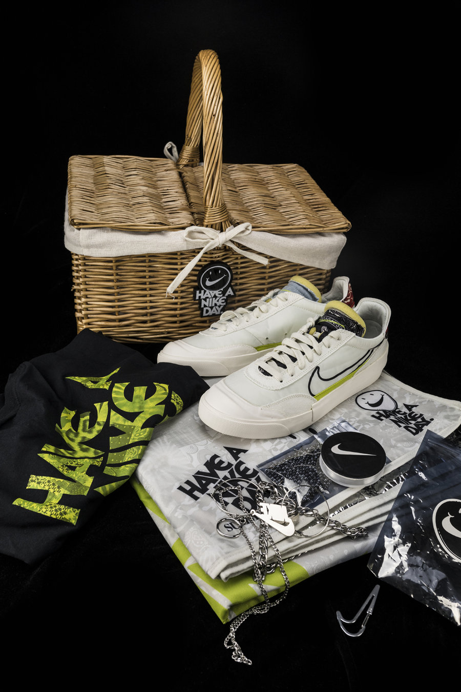 其中包含一双 Nike Drop-Type HBR,专属 T 恤、野餐布,以及 Nike 配件包,可以自制饰品配件。
