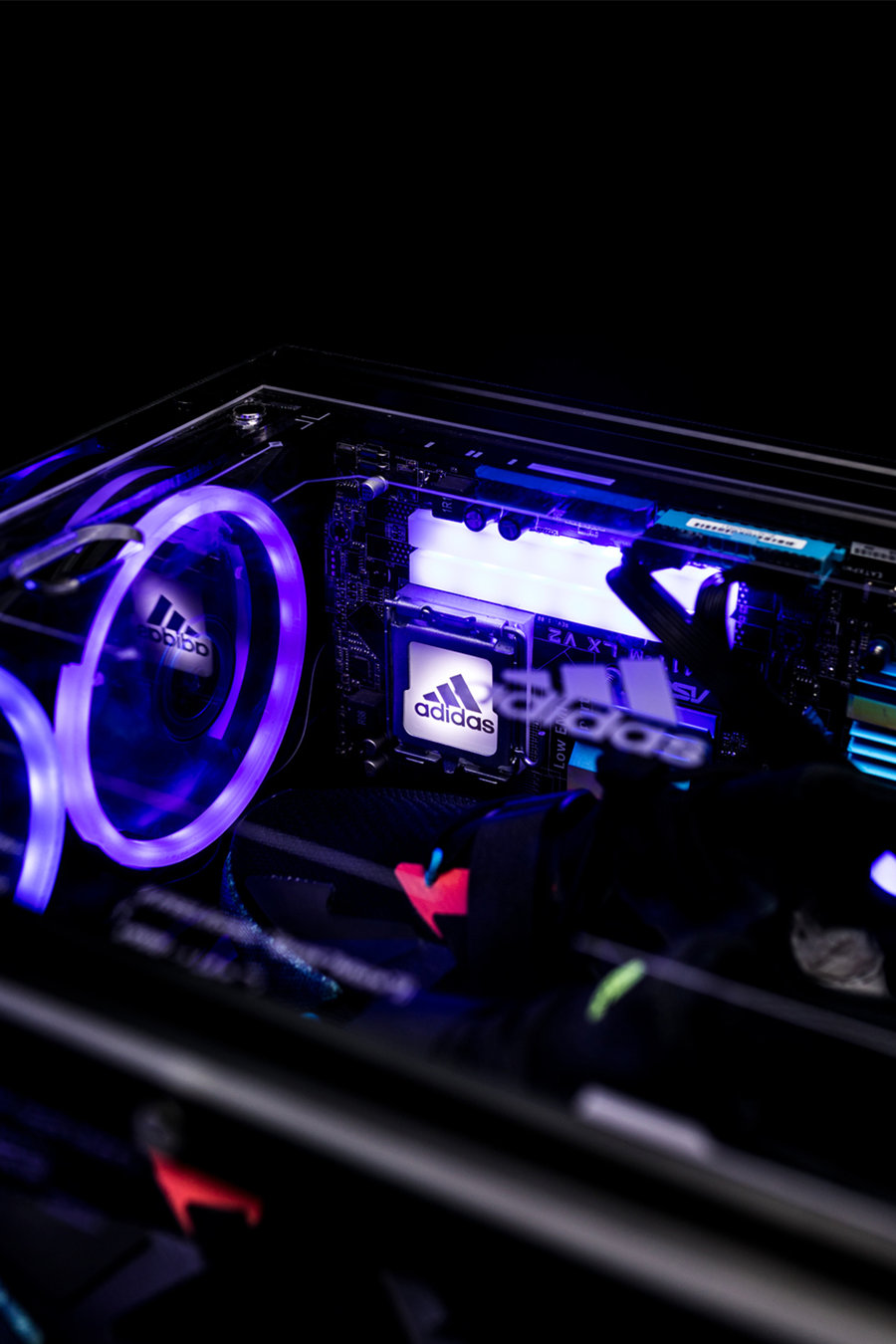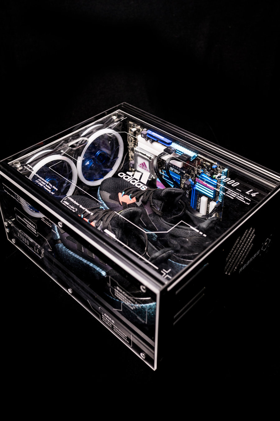 将鞋盒改为电脑机箱样式,同时鞋款放置在华硕主板上,侧面饰有 adidas CPU,主板、风扇更是一应俱全。
