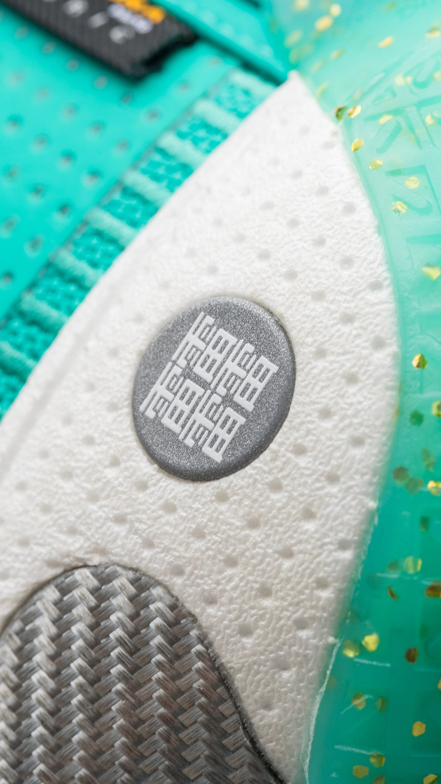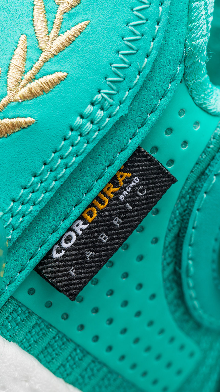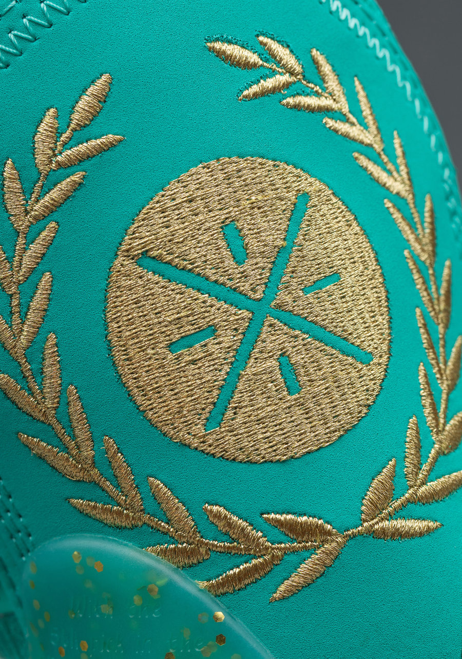 鞋身通体以蓝绿色装扮,穿插金色点缀,还原自由女神像的铜绿造型。